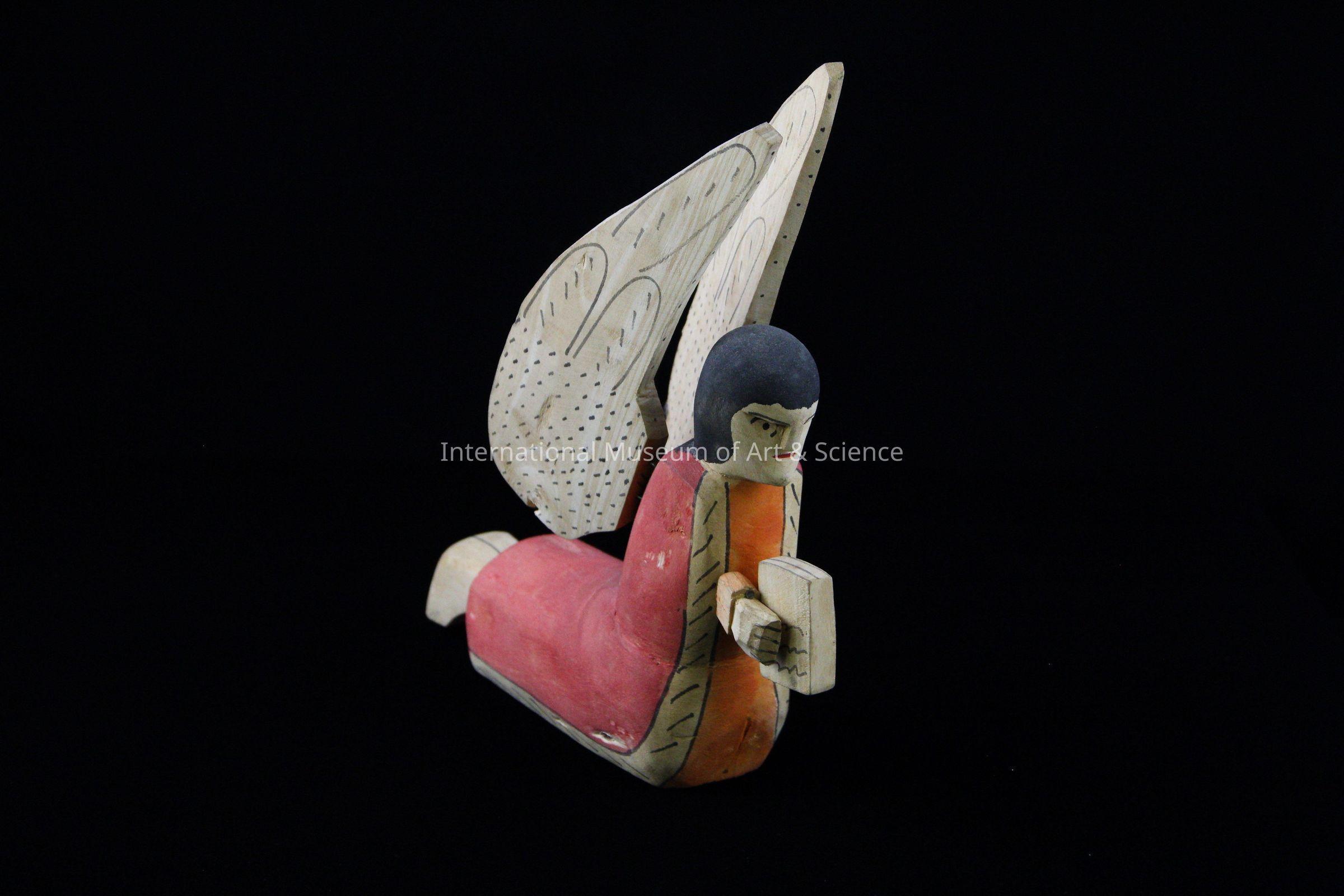 A wood carved figurine of a kneeling angel. The angel is holding a book in its hands. The angel is painted with different color stains, including: black, orange, and red.Dimensions