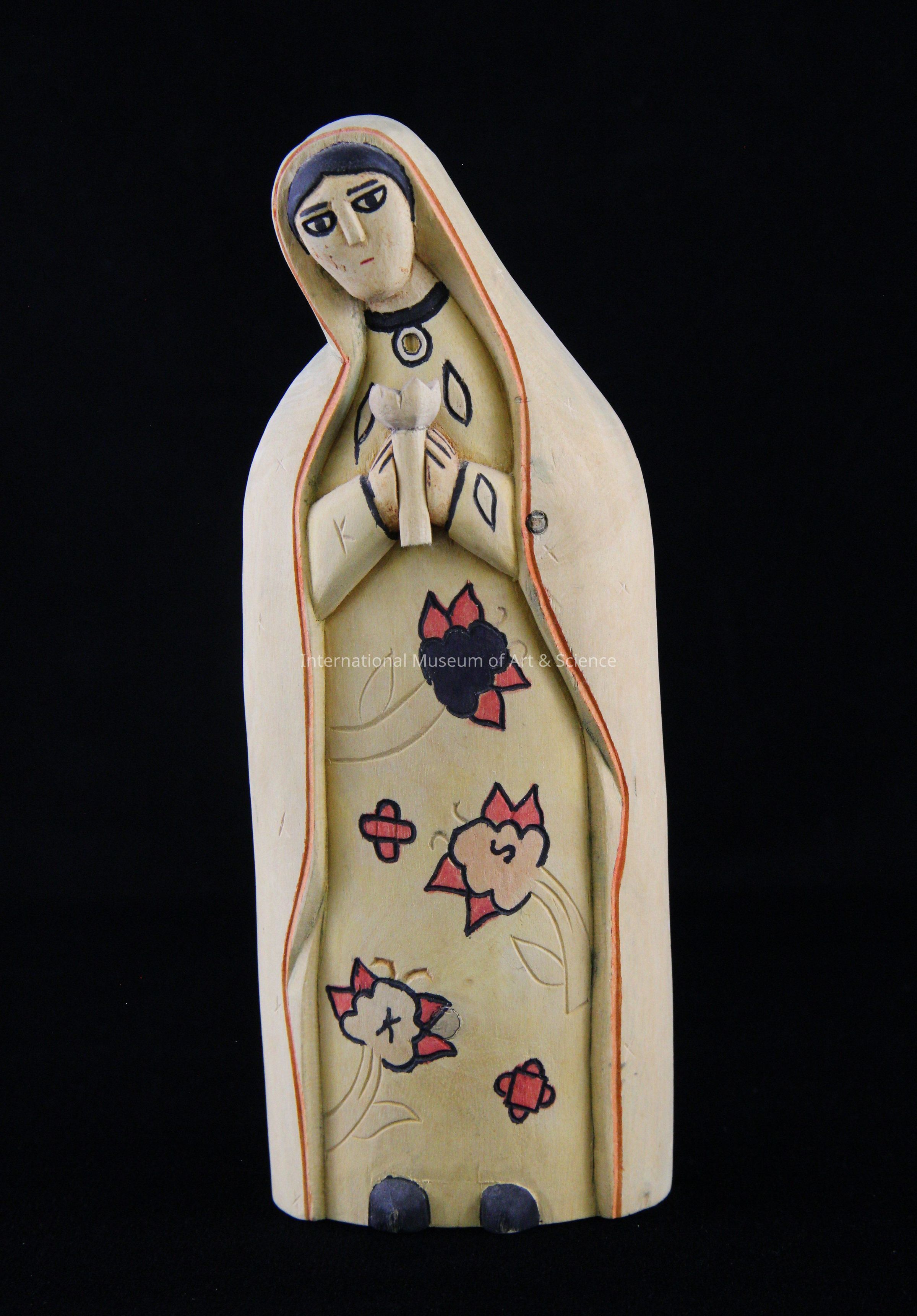 A wood carved figurine of the Virgin Mary. Most of the figure is natural wood, but some areas have been colored with stain to show certain flower designs. The figurine is holding a yellow flower.Made/Created