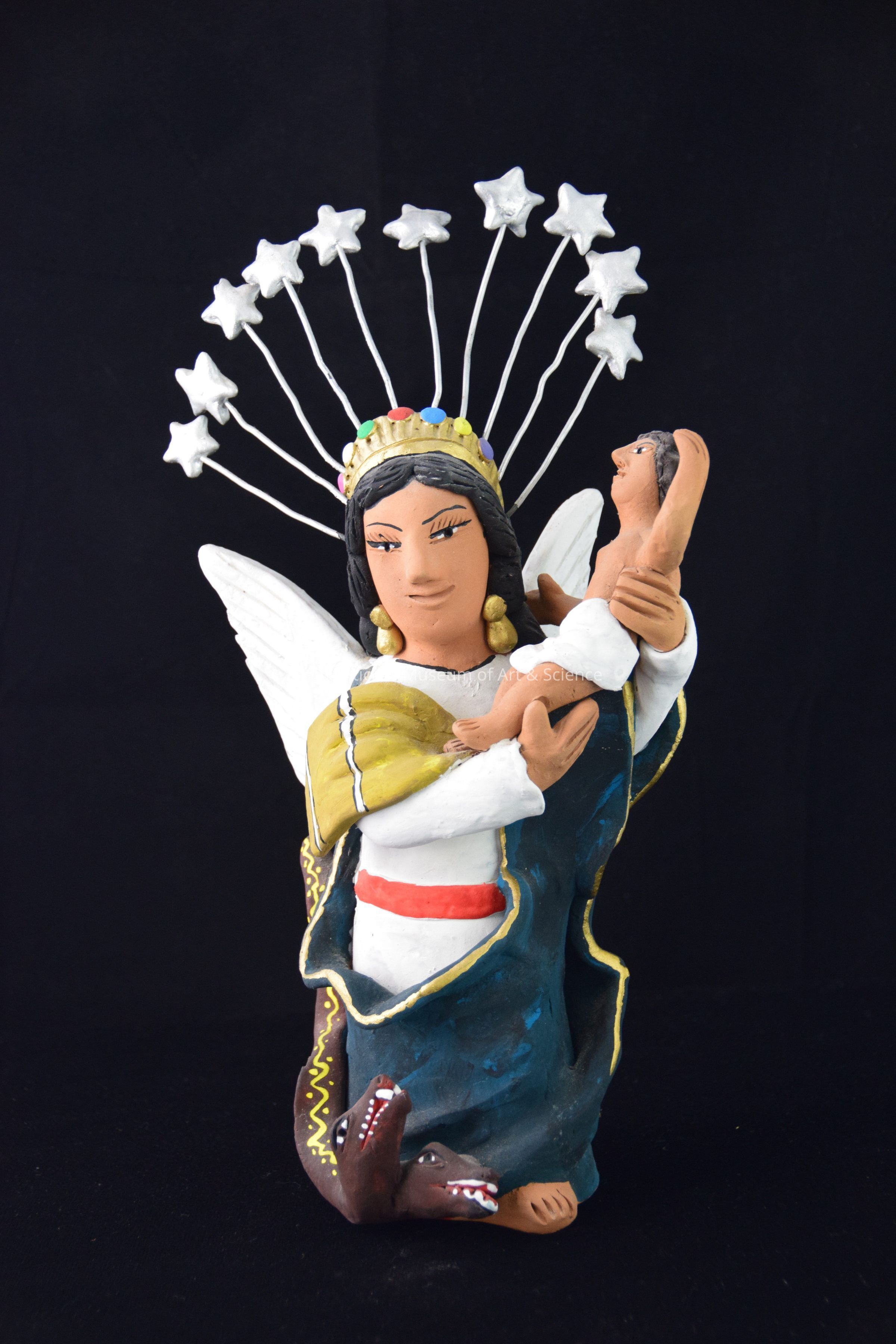 A ceramic figurine of the Virgin Mary. The figure is wearing a white dress with a red sash, and a dark green robe. The figure is wearing a gold crown with colored gems. Coming out from the crown are ceramic silver stars attached by wires. The Mary figure is holding the Christ child in her arms and is standing over two snakes.Dimensions