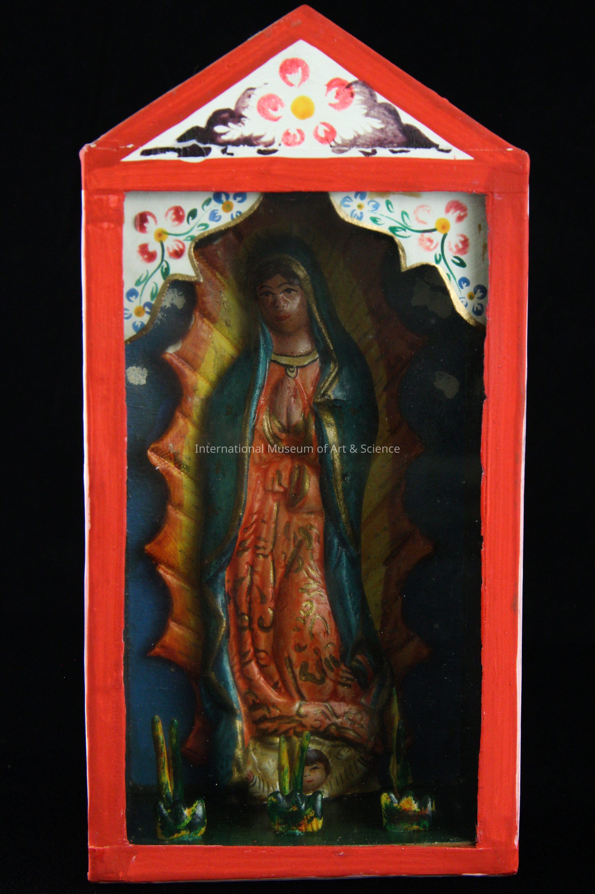 A small wooden retablo with a ceramic Guadalupe and three small cactus inside. The box is painted with floral designs.Artwork Details