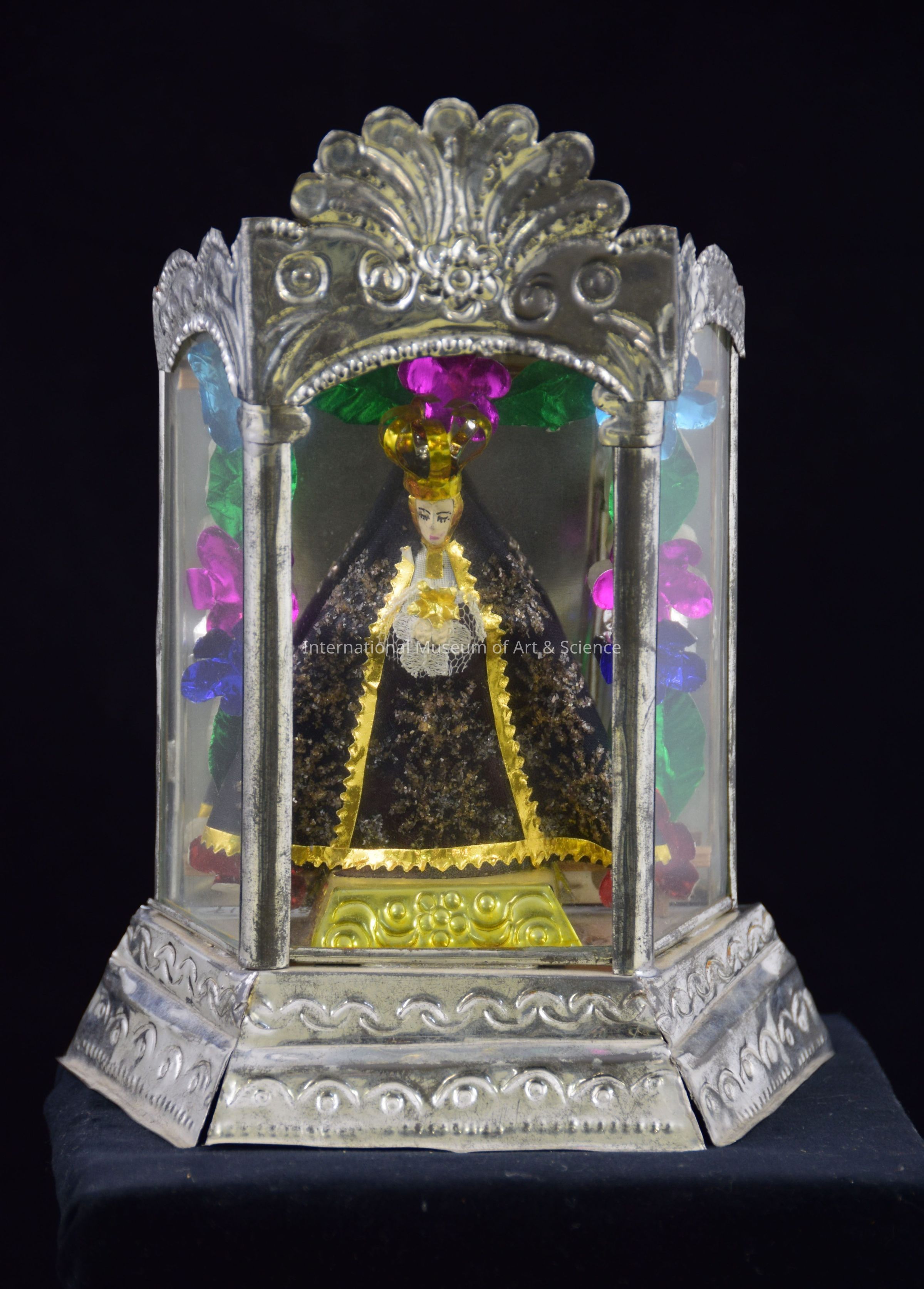 A figurine of Our Lady of Sorrow is a stamped metal and glass shrine. The figure is made from wood ad fabric. She stands on a gold platform inside of the shrine. She stands in front of a archway of foil paper flowers. The shrine is made from stamped tin or alumium with three glass panels on the front and a mirrored panel on the back.