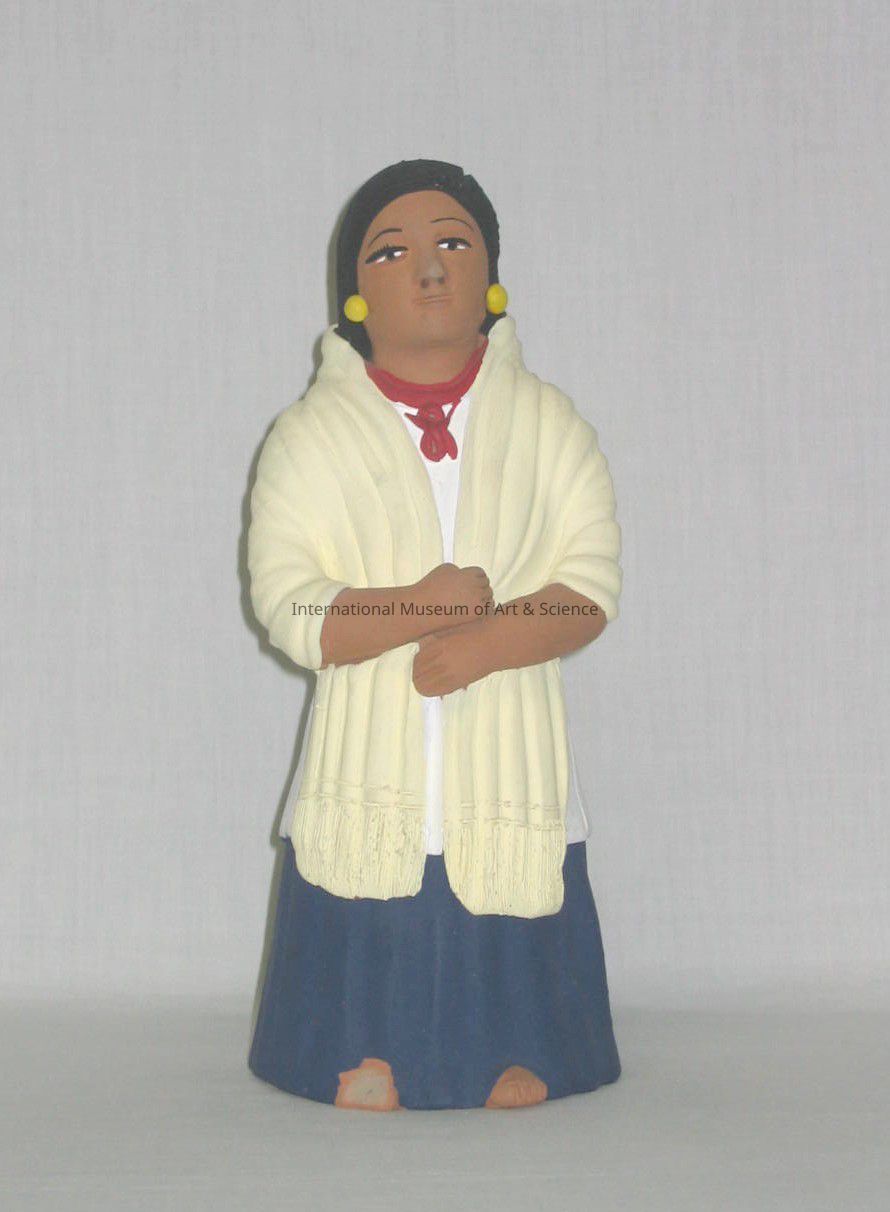 A clay figurine of a woman wearing a white and blue dress with a yellow shawl.