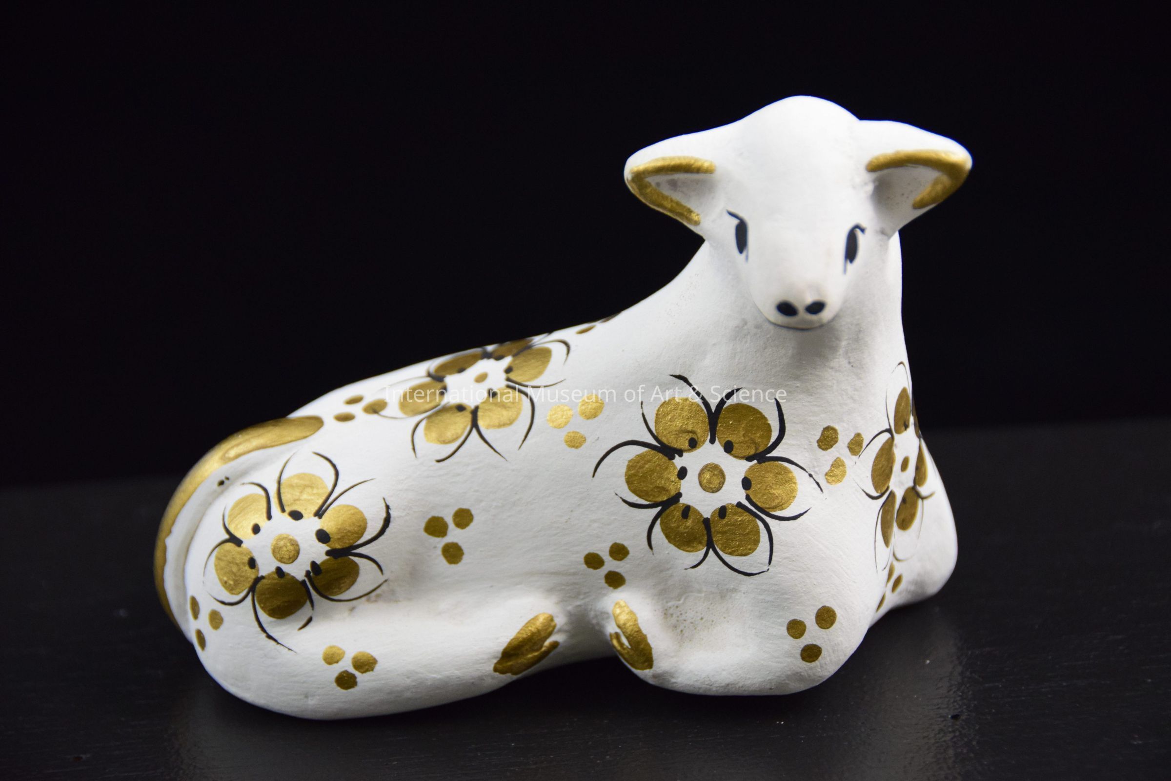A ceramic figurine of a cow. It is white with gold ears and tail. It is decorated with black and gold floral motifs. It is part of a 16 piece Nativity Set.Dimensions