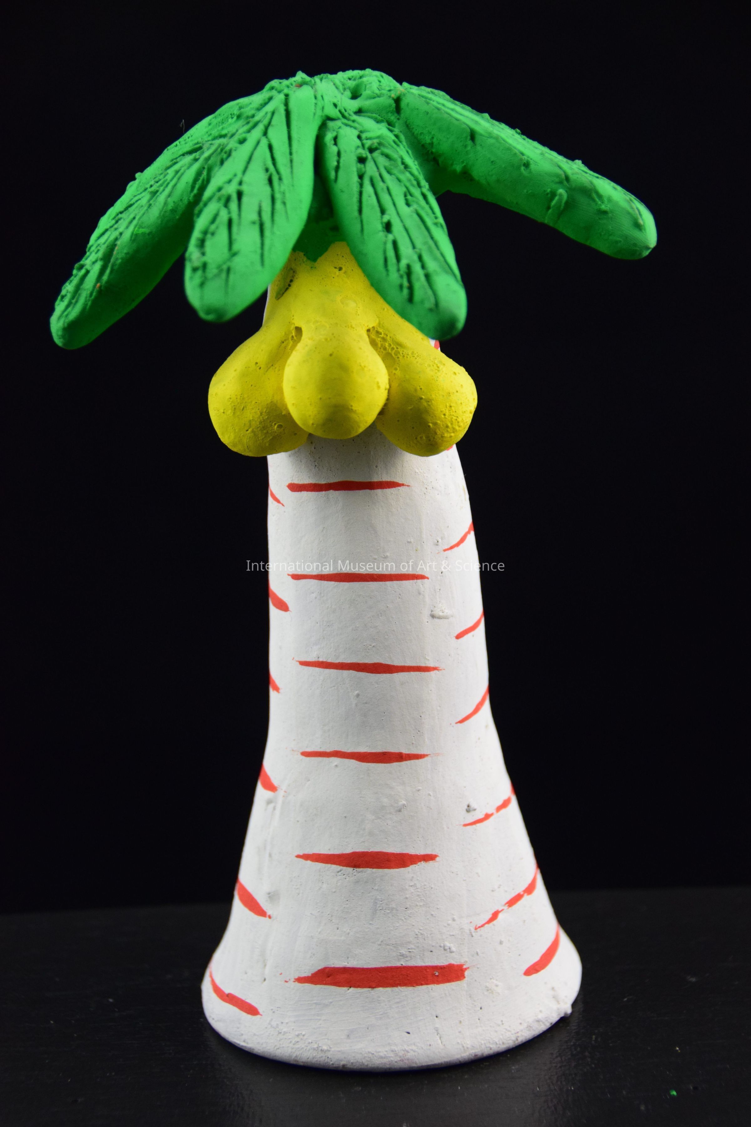 Clay palm tree figurine. It is a white tree with orange stripes, and three yellow coconuts. It is part of a set of 12 clay palm trees.