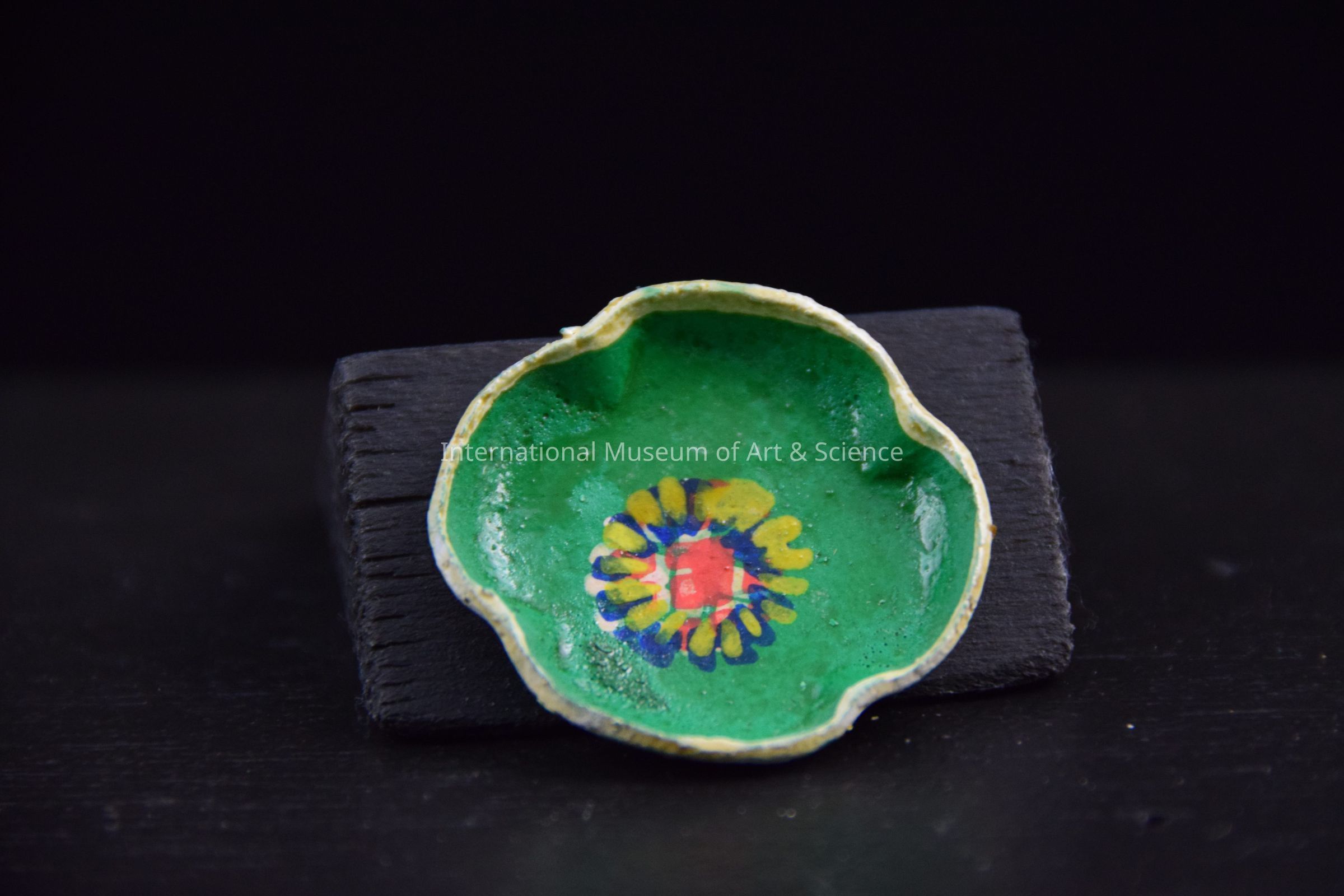 A ceramic miniature nested pottery platter. The inside is painted green with floral designs. There is a white curved edge.Artwork Details