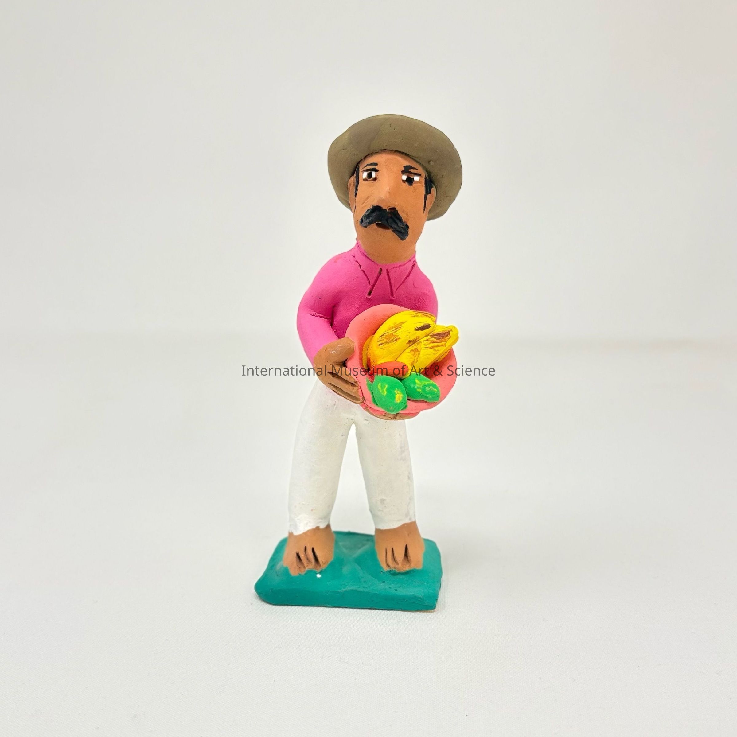 A clay figurine of a man wearing a brown hat, a pink shirt, carrying a bowl of fruit. He is part of a marketplace scene.Dimensions