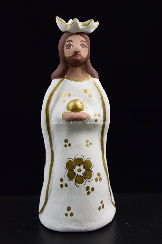 A ceramic figurine of a Wiseman/Magi. He is wearing a white robe, cape, and crown. He is holding a gold gift in his hands. His outfit is decorated with black and gold floral motifs. He is part of a 16 piece Nativity Set.Dimensions