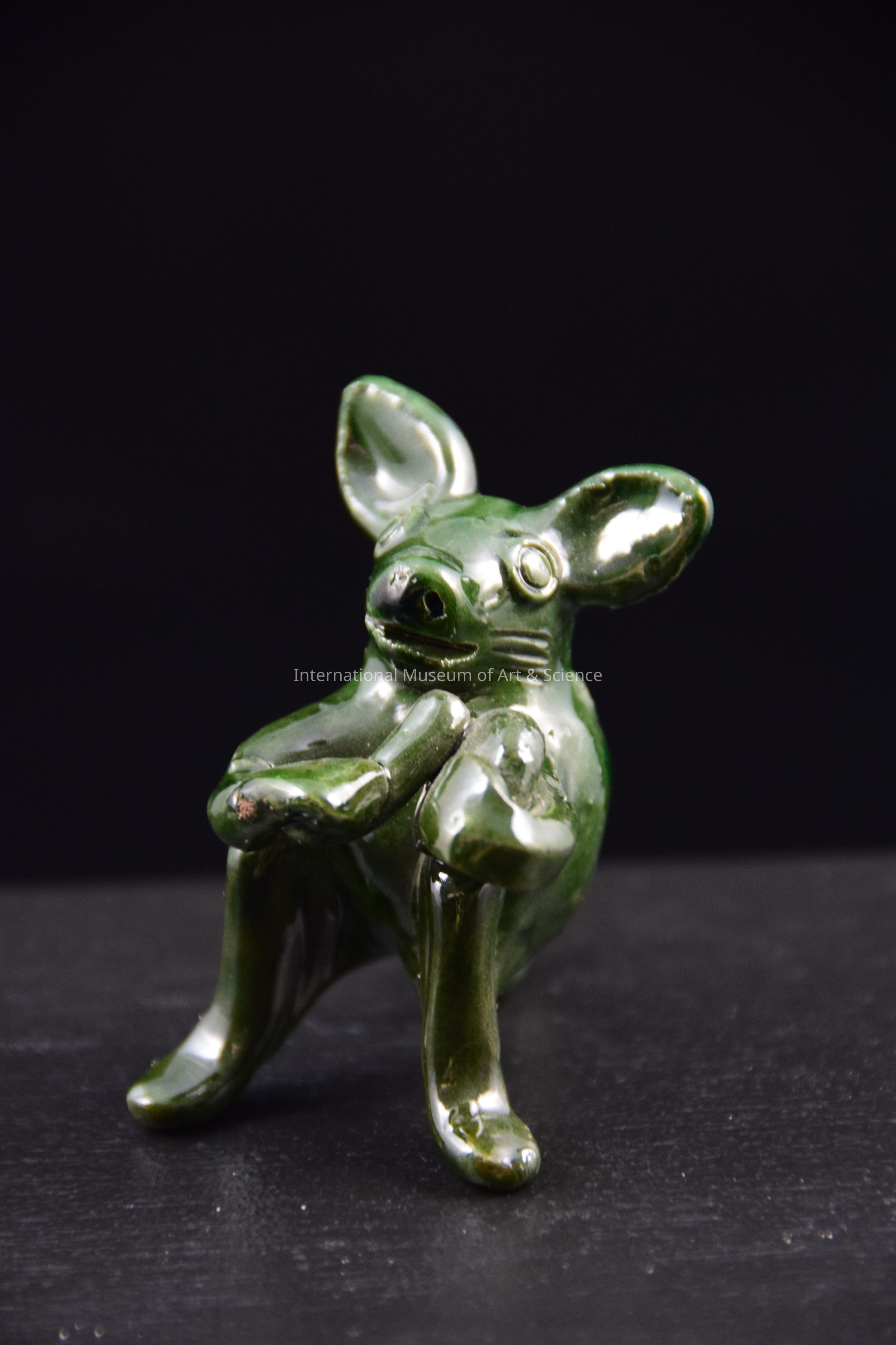 A ceramic figurine of an animal playing an instrument. The animal is proped up on its hind legs and tail and is playing the drum. It is glazed in dark green. There is a hole in the animal's back. This piece is part of a group of animals playing musical instruments.Dimensions