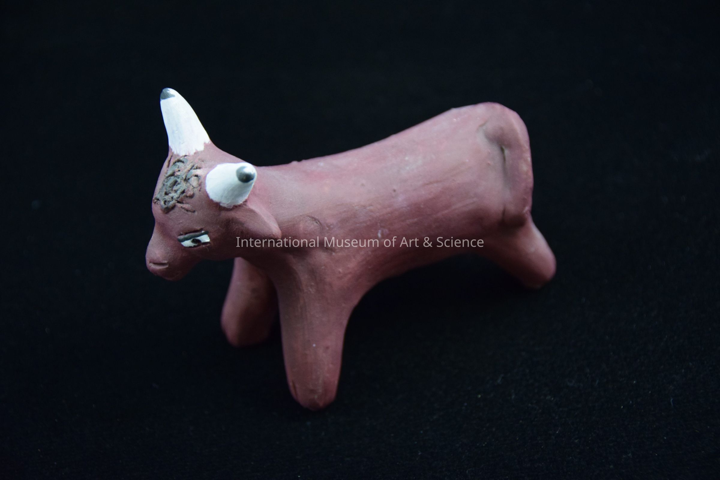 A ceramic figurine of a cow. It is colored maroon with white and black horns. It is part of a Wedding party and cart scene.
