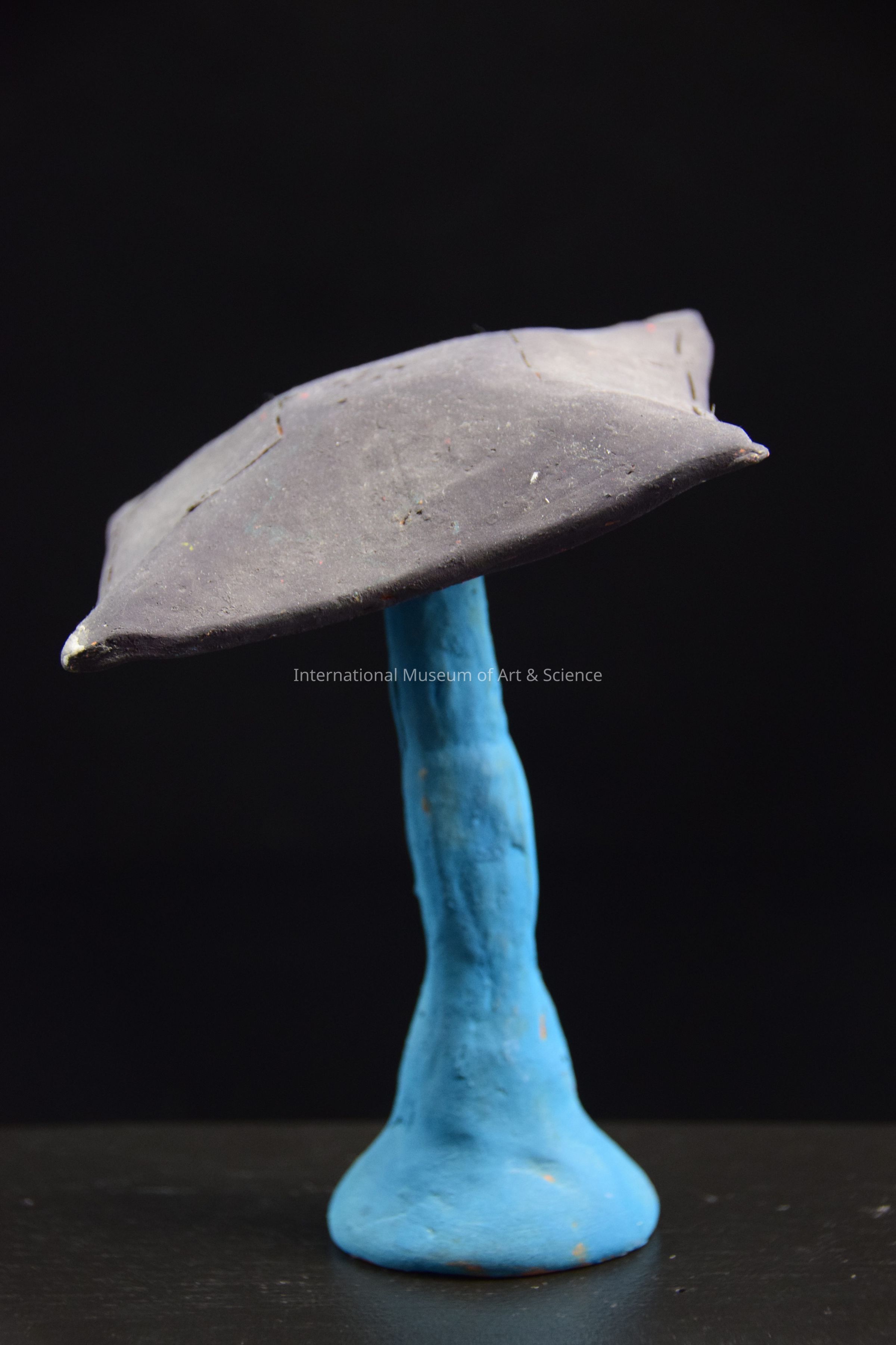 A cermic figurine of a standing umbrella. The umbrella/tent top is painted black and its pole and base are an aqua blue. It it part of a market scene.