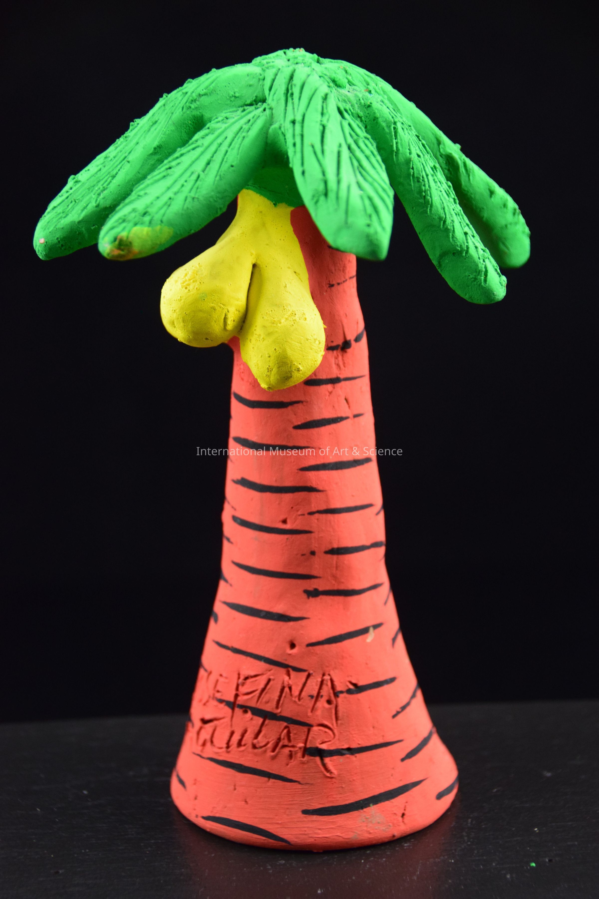 Clay palm tree figurine. It is an orange tree with black stripes, and three yellow coconuts. It is part of a set of 12 clay palm trees.