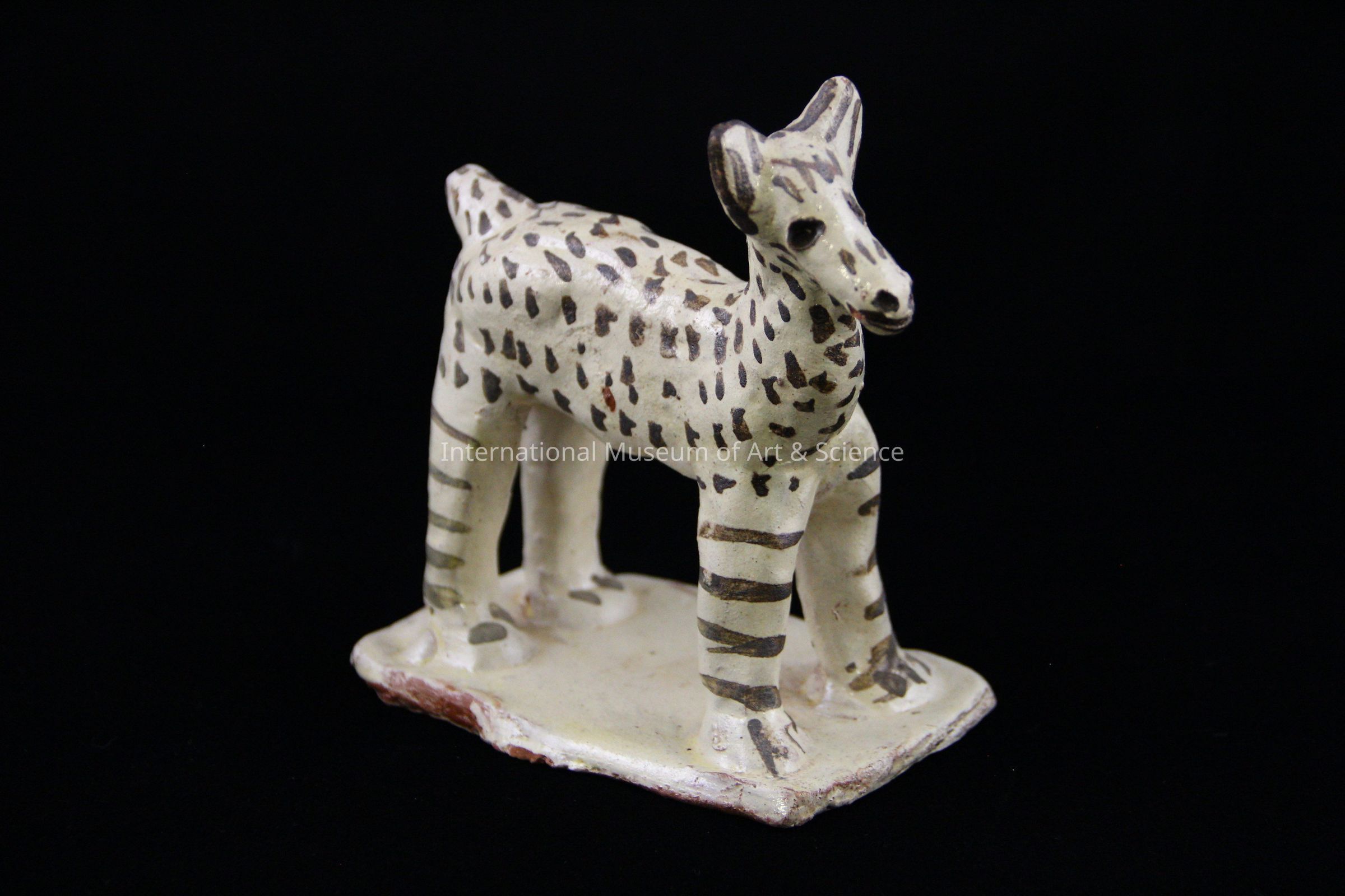 A ceramic llama. The figurine has a cream background, brown horizontal striped legs, brown spots on body, and a short tail. It stands on a rectangular base. It is part of a group of animals from a Nativity scene.Ethnography