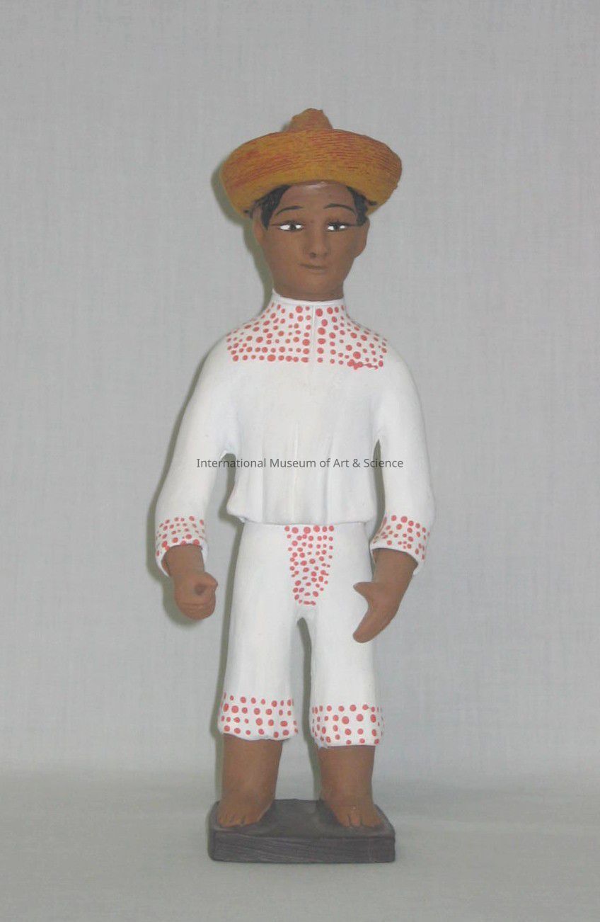 A clay figurine of a man wearing traditional dress of white pants with a matching white shirt. Both have red detailing. He is also wearing a hat.Made/Created