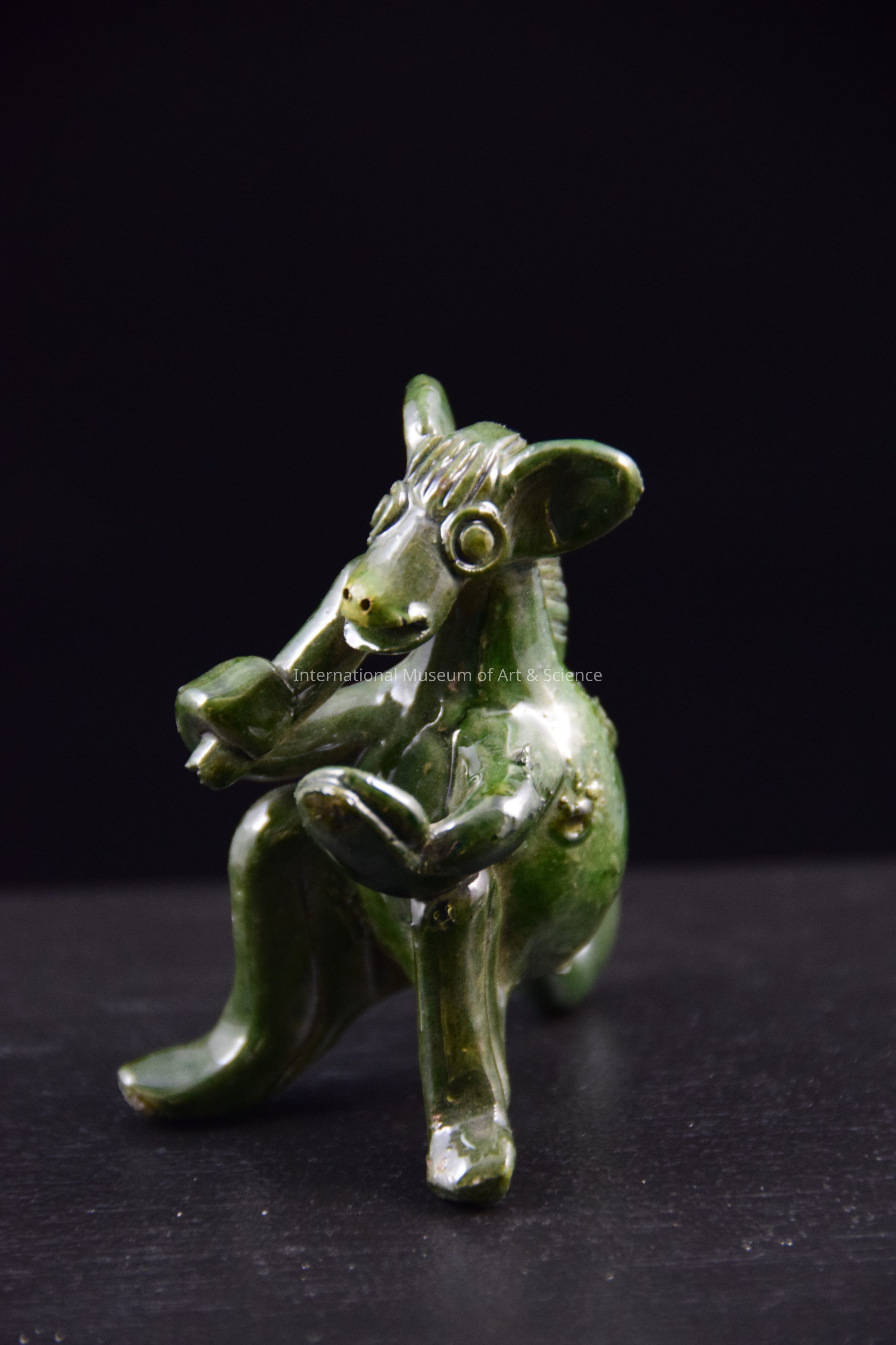 A ceramic figurine of an animal playing an instrument. The animal is propped up on its hind legs and tail and is playing a percussion instrument. It is glazed in dark green. There is a hole in the animal's back. This piece is part of a group of animals playing musical instruments.Dimensions