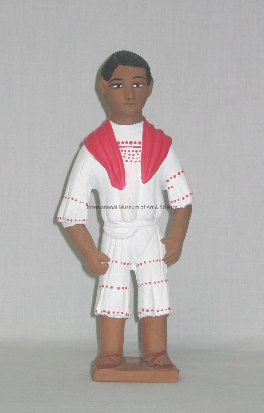 A clay figurine of a young man wearing a white shirt and white shorts. Both have red detailing. He also has a red scarf around his neck.Made/Created