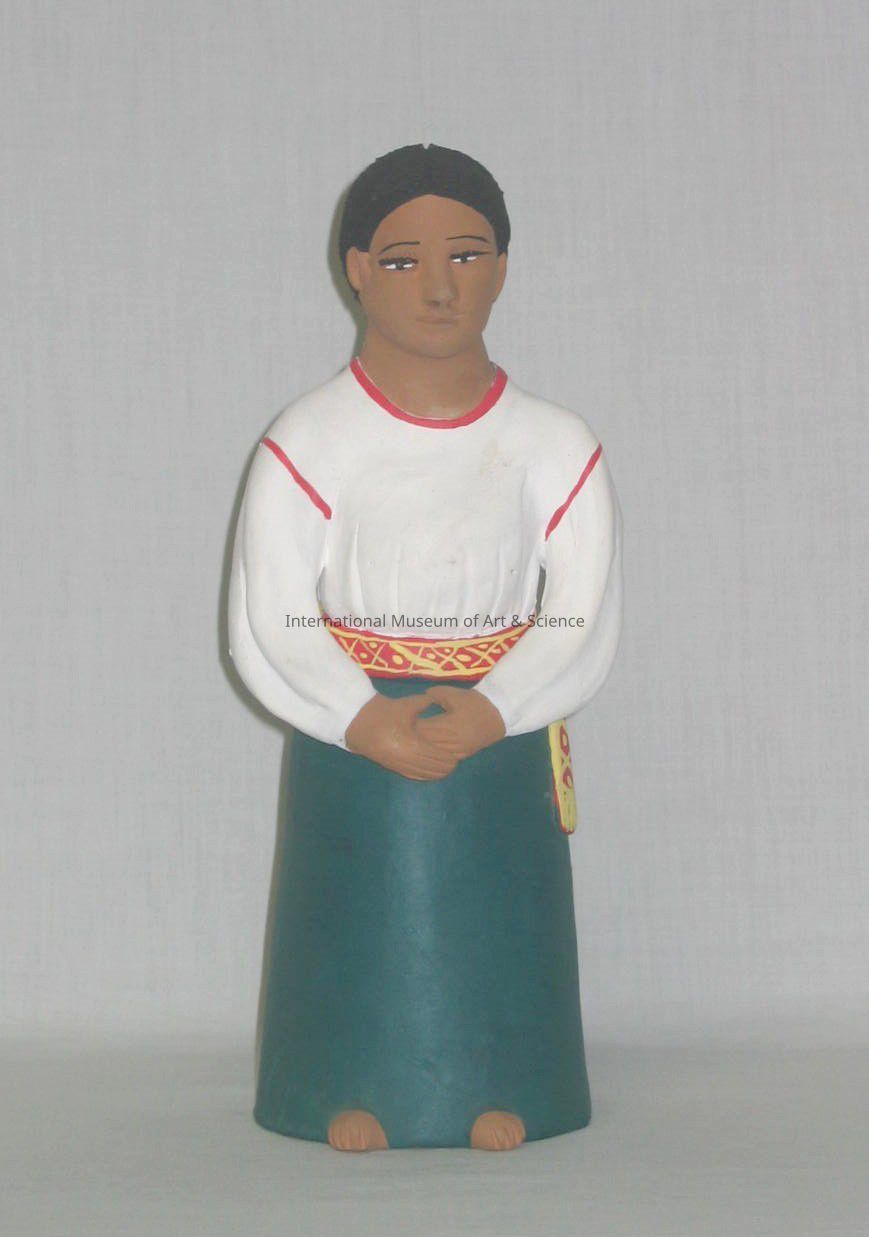 A clay figurine of a woman. She is wearing a white top with red detailing, a dark green skirt, and a red and yellow patterned belt.Made/Created