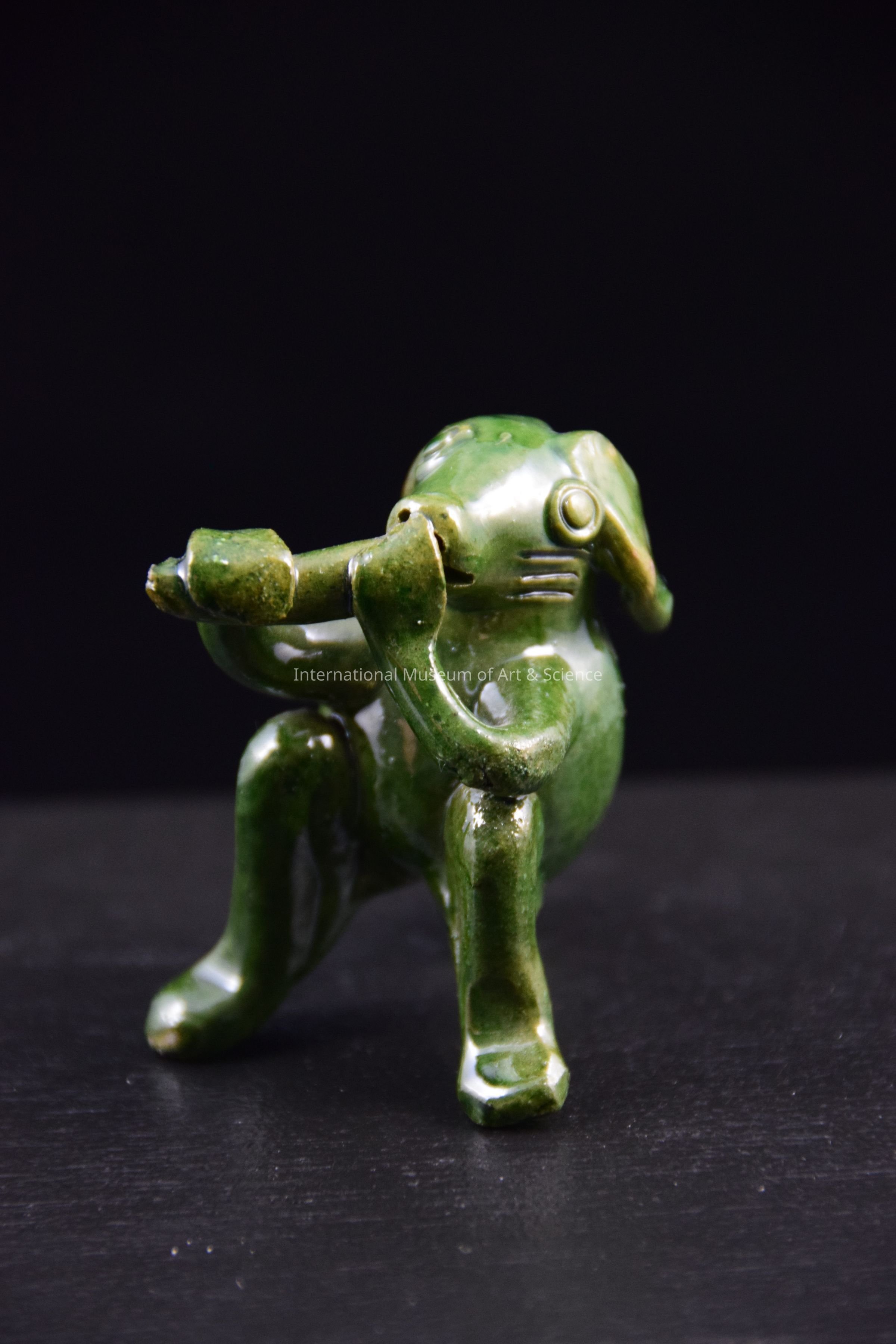 A ceramic figurine of an animal playing an instrument. The animal is propped up on its hind legs and tail and is playing a flute. It is glazed in dark green. There is a hole in the animal's back. This piece is part of a group of animals playing musical instruments.Dimensions