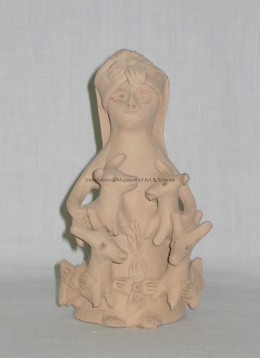 A clay figurine of a woman. The woman is holding an animal under each arm, and has two more animals at her feet. She is wearing a head scraf with a flower on the front, her dress also has flowers on it.