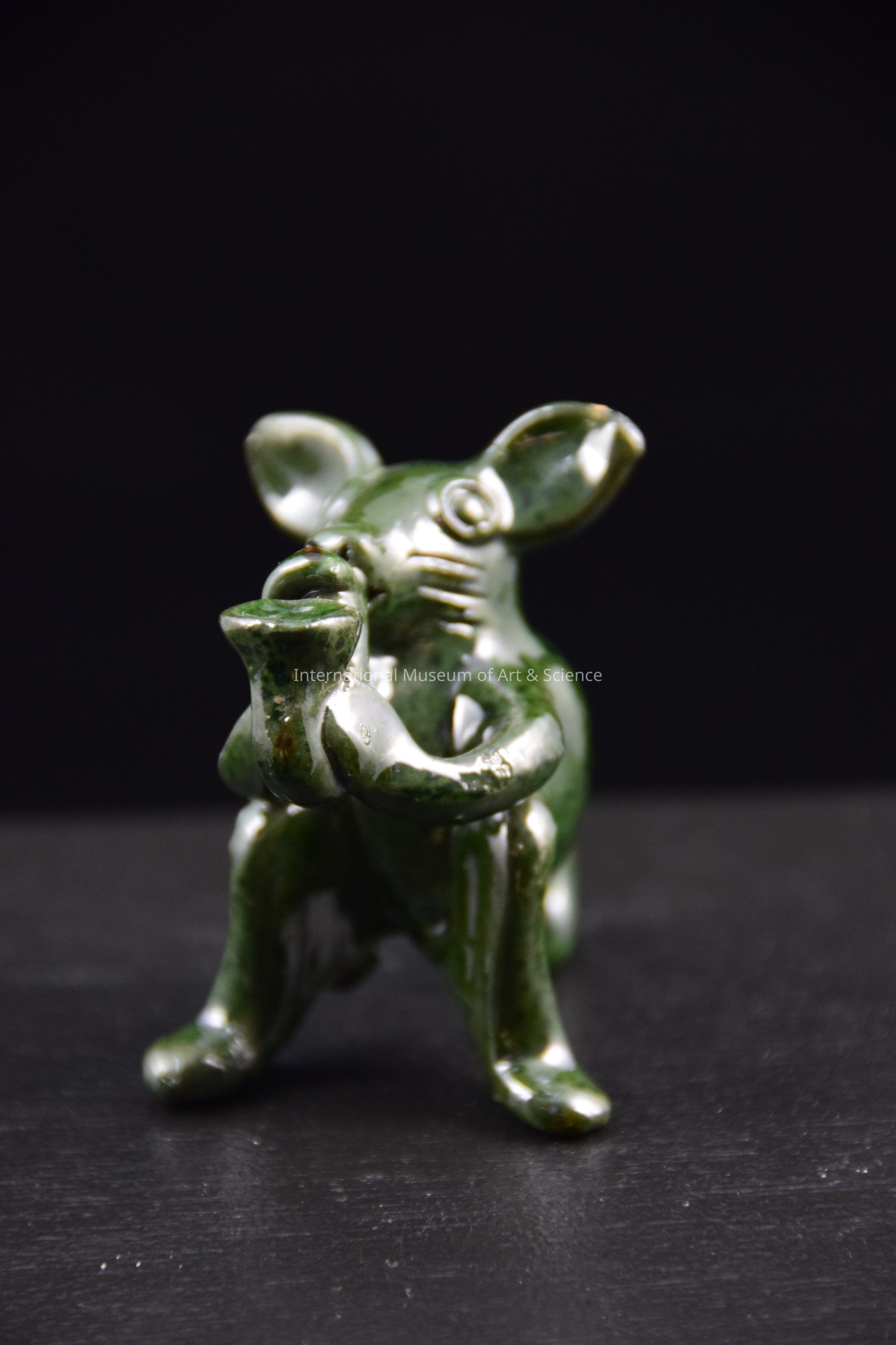 A ceramic figurine of an animal playing an instrument. The animal is proped up on its hind legs and tail and is playing the saxophone. It is glazed in dark green. There is a hole in the base of the animal. This piece is part of a group of animals playing musical instruments.Dimensions