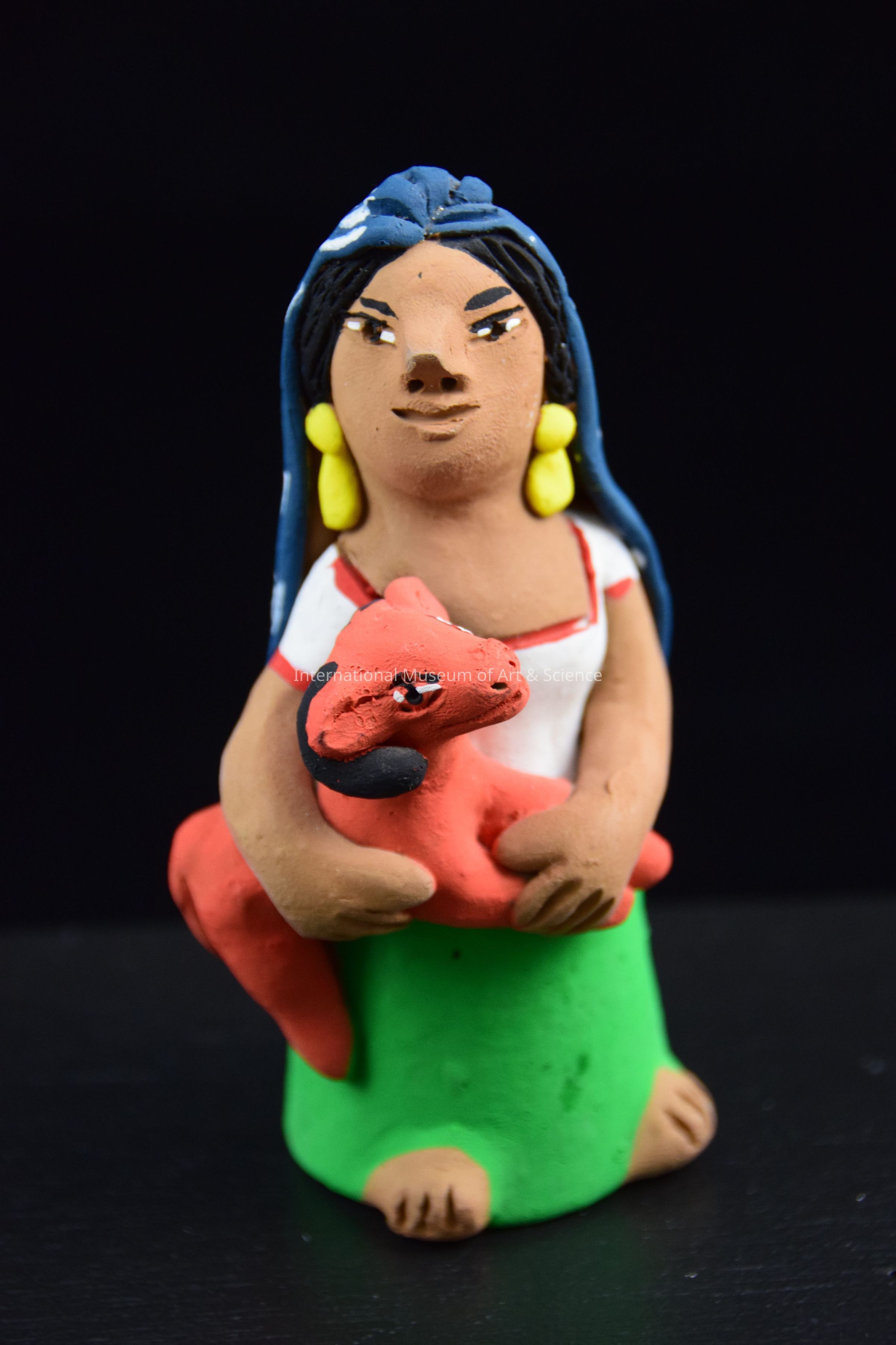 A ceramic figurine of a woman in a white blouse with red trim, a green skirt, and a navy blue head scarf. She is holding a orange colored ram in her arms.Dimensions