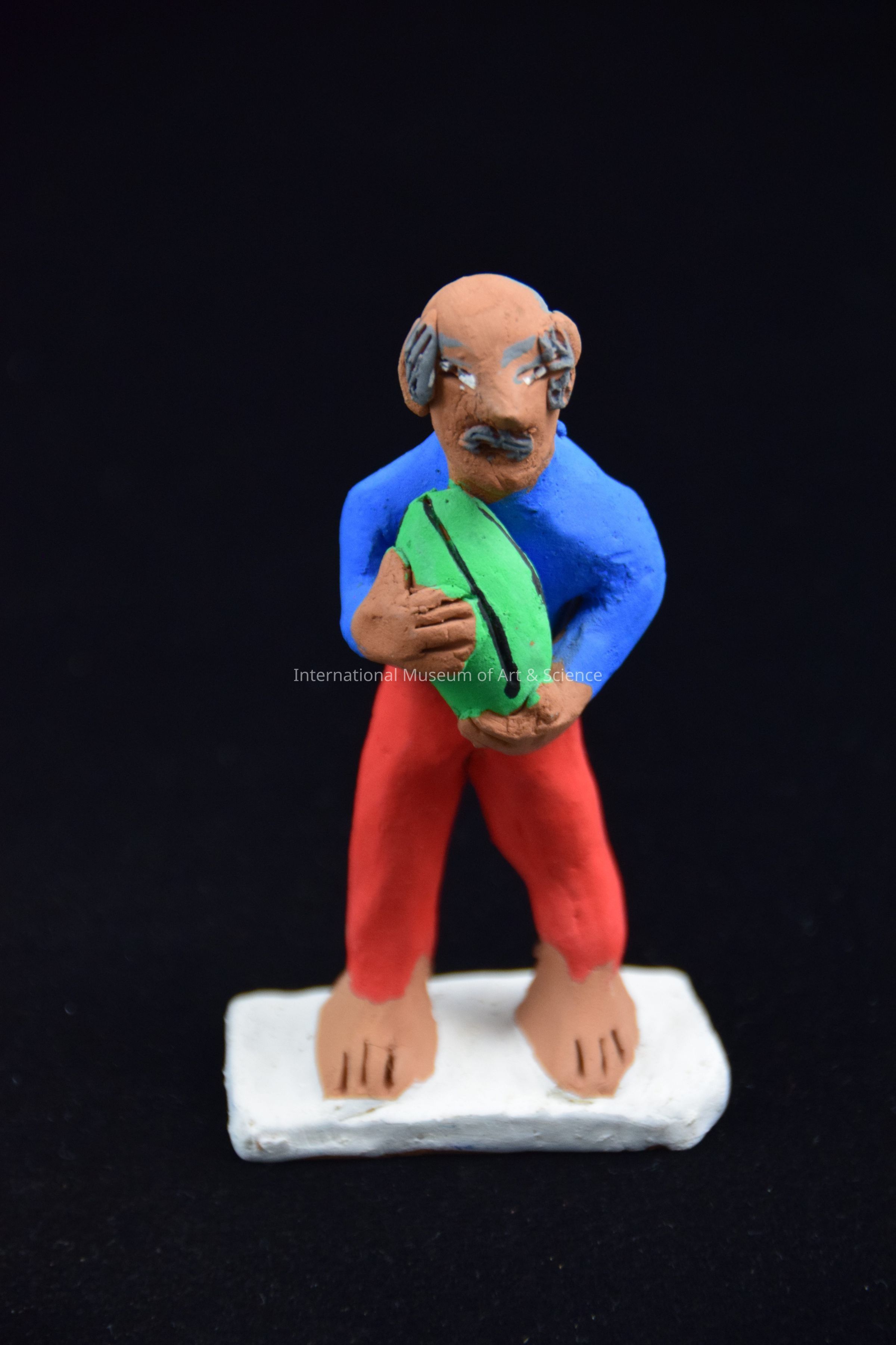 A clay figurine of a man wearing a blue shirt, red pants, and holding a green melon. He is part of a marketplace scene.Dimensions