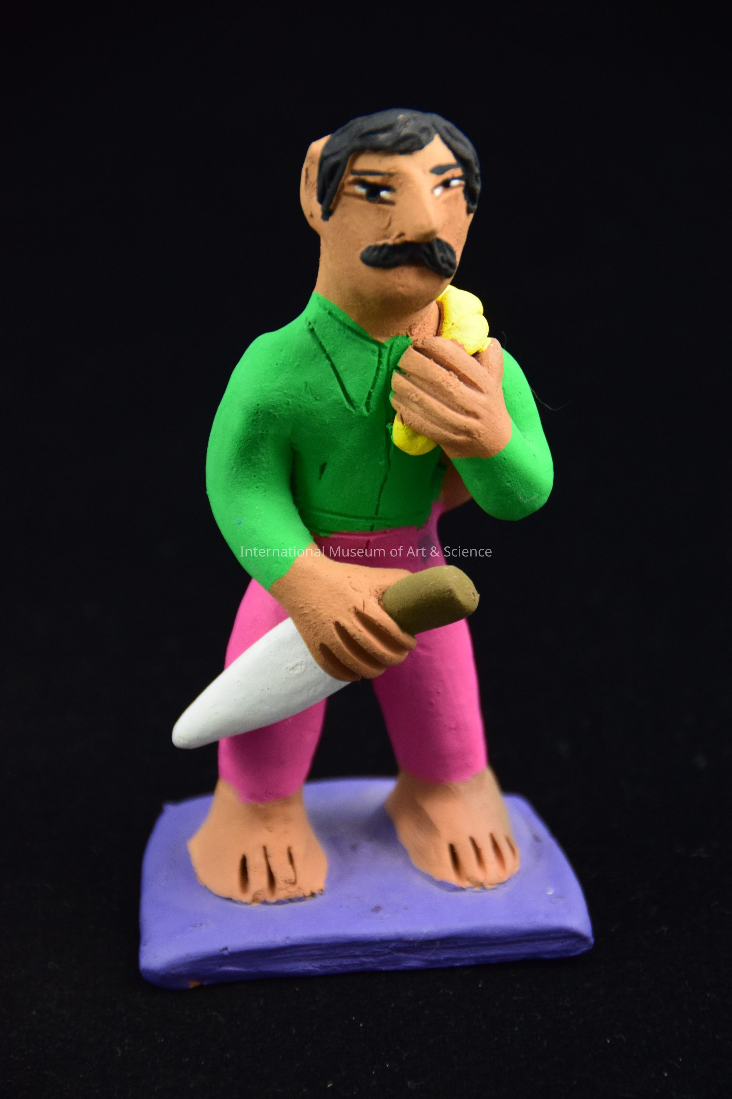 A figurine of a man wearing a green shirt, holding a brown jug over his shoulder with a yellow rope. he has a white machete knife in his right hand. He is part of a marketplace scene.Dimensions