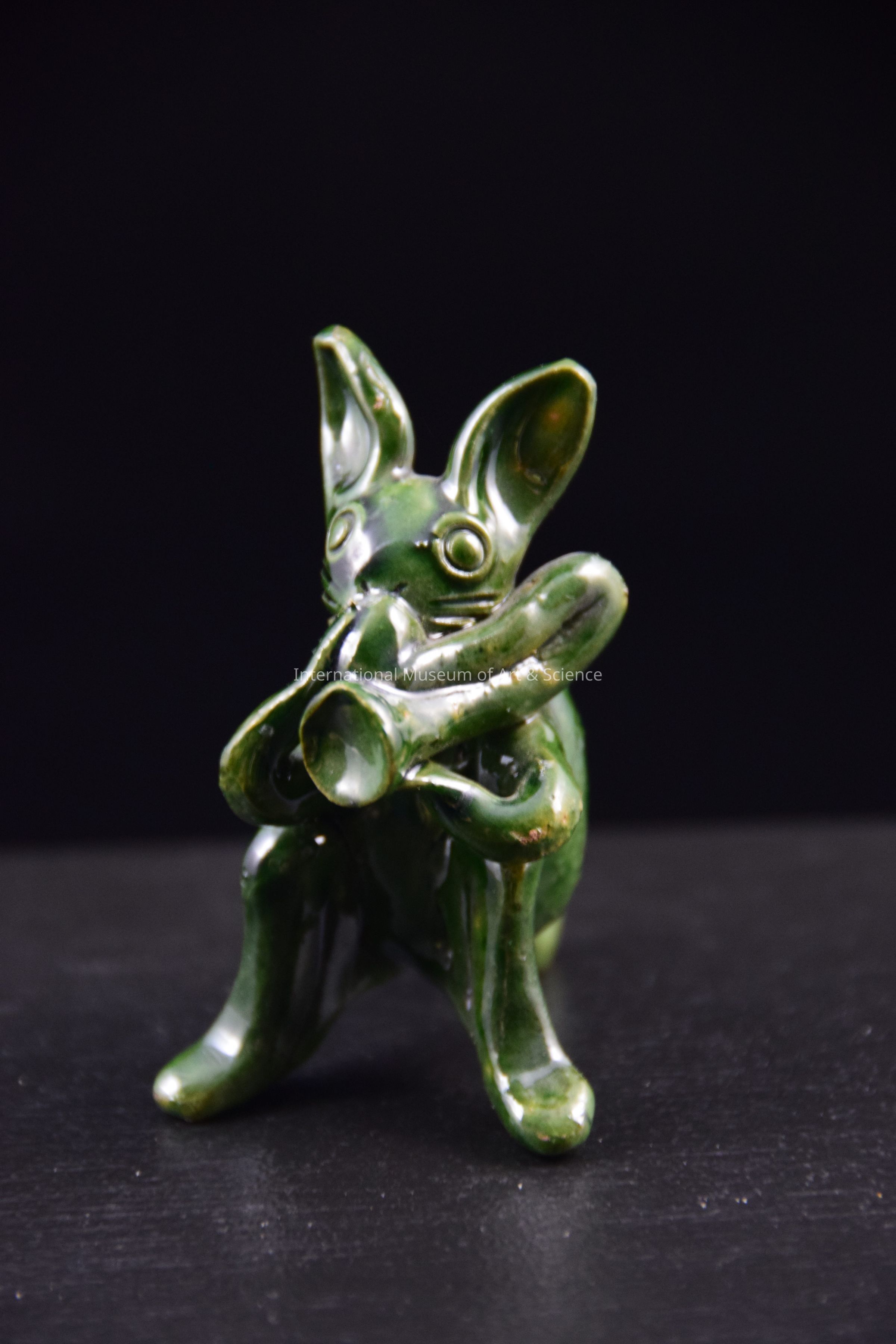 A ceramic figurine of an animal playing an instrument. The animal is proped up on its hind legs and tail and is playing the trumpet. It is glazed in dark green. There is a hole in the animal's back. This piece is part of a group of animals playing musical instruments.Dimensions