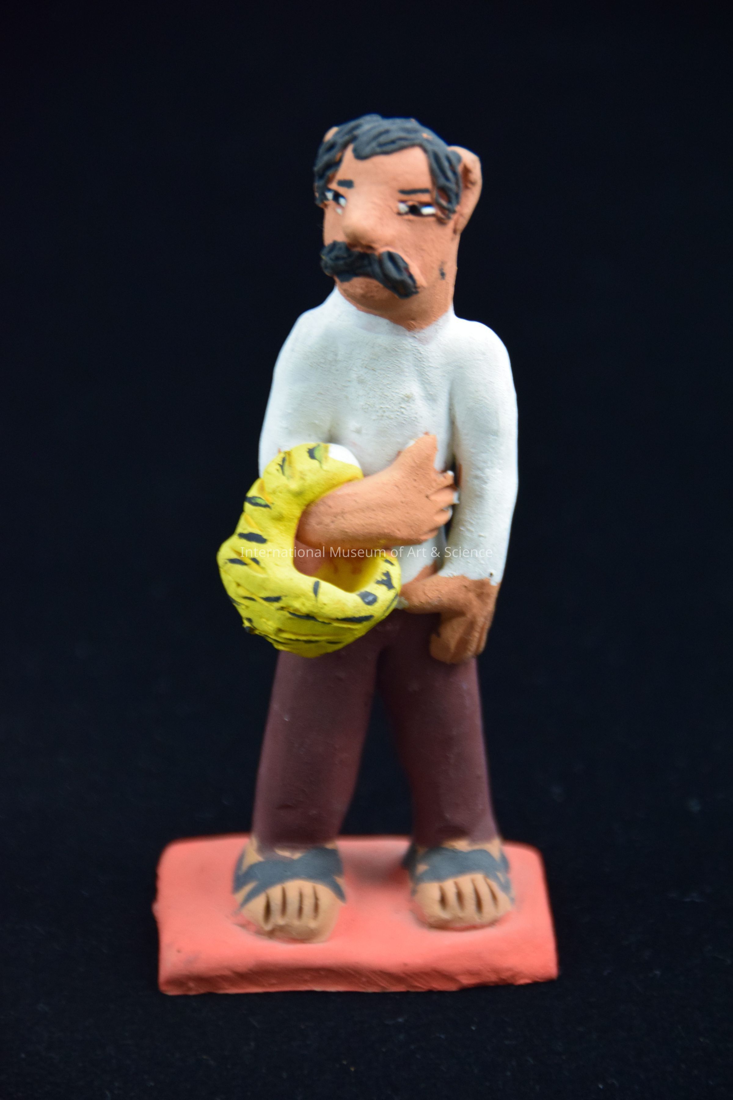 A clay figurine of a man wearing a white shirt, brown pants, carrying a yellow basket. He is part of a marketplace scene.