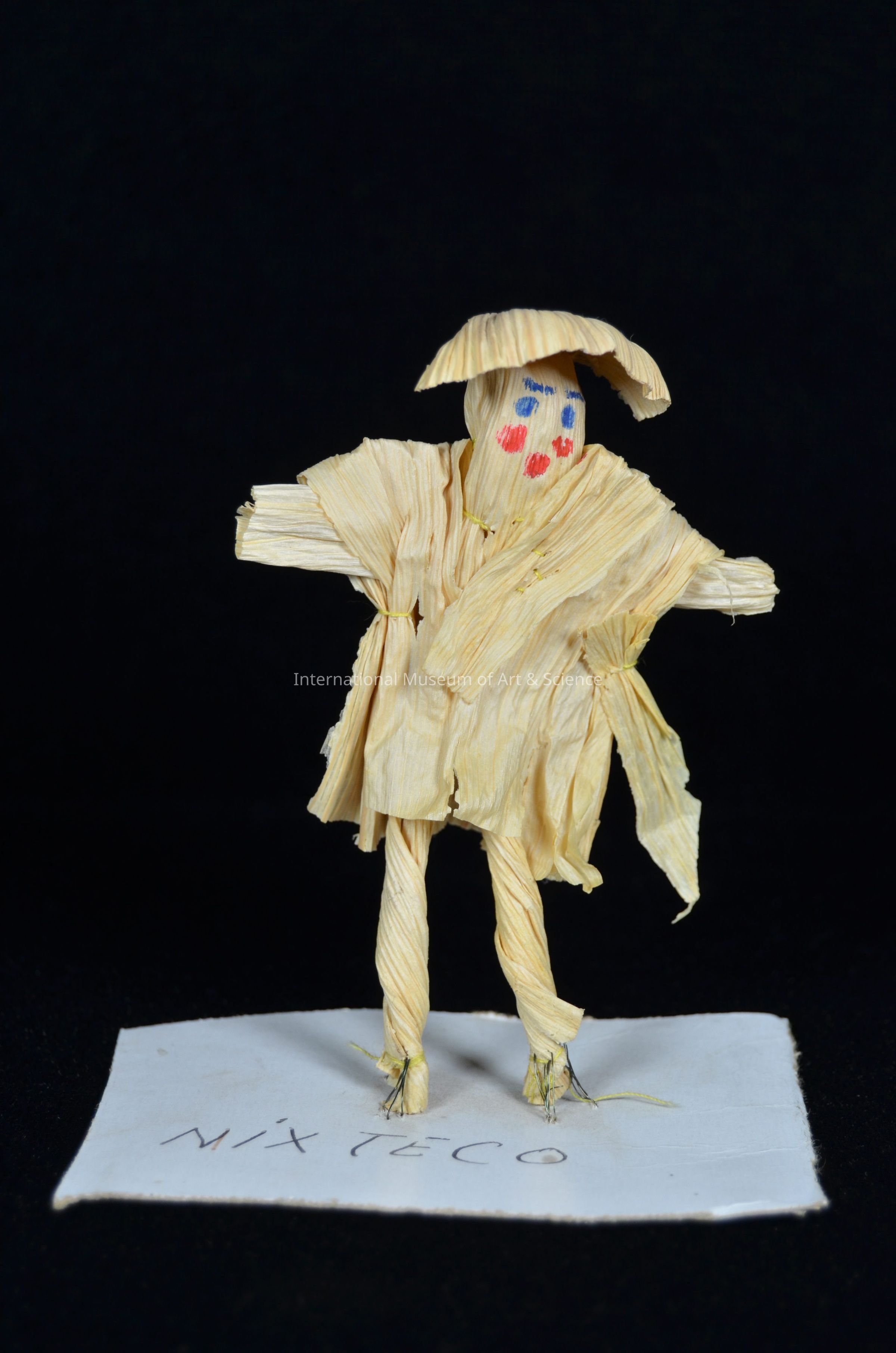 A small corn husk figurine. The figure is a man wearing a poncho and sombrero. The facial features are painted on in red and blue. The figure is sewn onto a piece of cardboard. "NIXTECO" is written on the base. This figure is part of a set that represents different languages groups from Mexico.Artwork Details