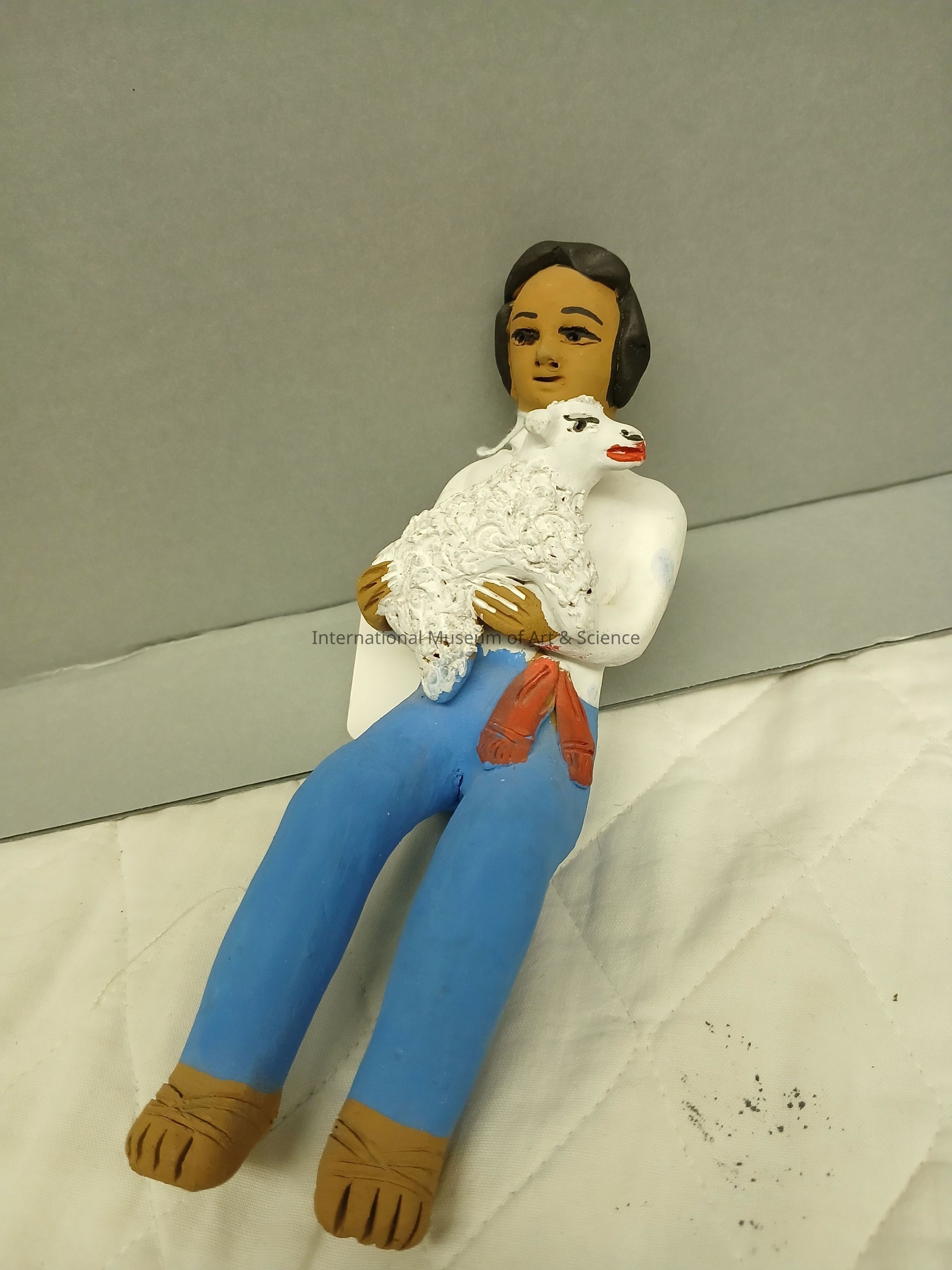A figurine of a man seated with lamb, he is wearing blue trousers and a white shirt. This figurine is from a large grouping of figures "Wedding party and cart."Artwork Details