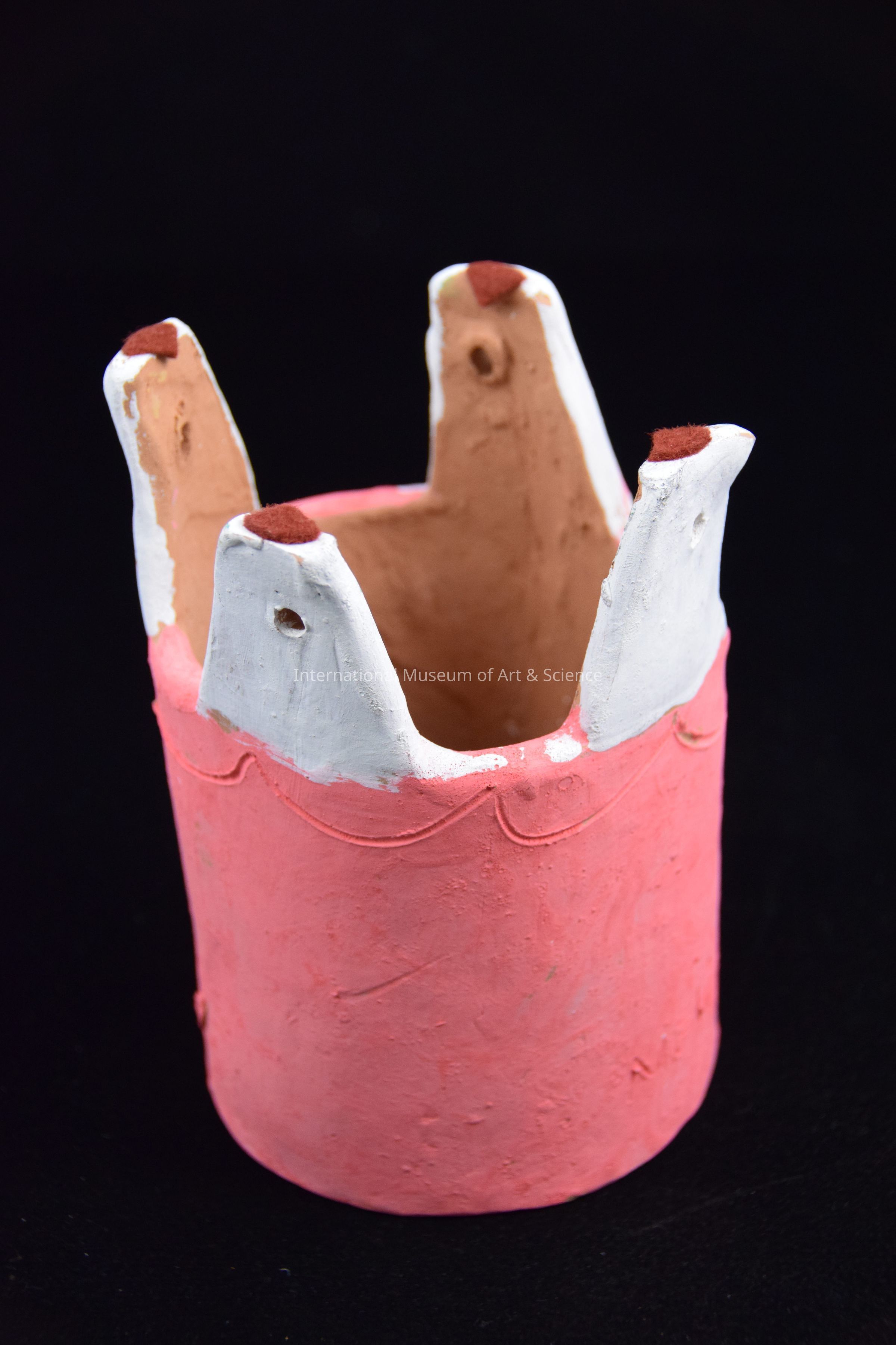 A ceramic figurine of a pagoda base. The base building is circular in shape with a pink outside and white pillars. It is part of a Zocalo scene. The scene has 28 clay pieces brightly painted, representing a park scene.Dimensions