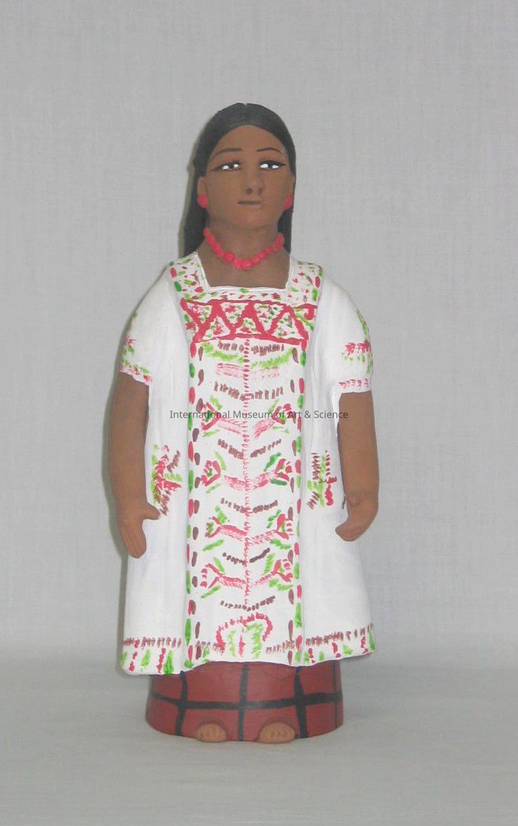 A clay figurine of a woman wearing a white dress with pink and green detailing. She has long black hair and is wearing a red necklace.Made/Created