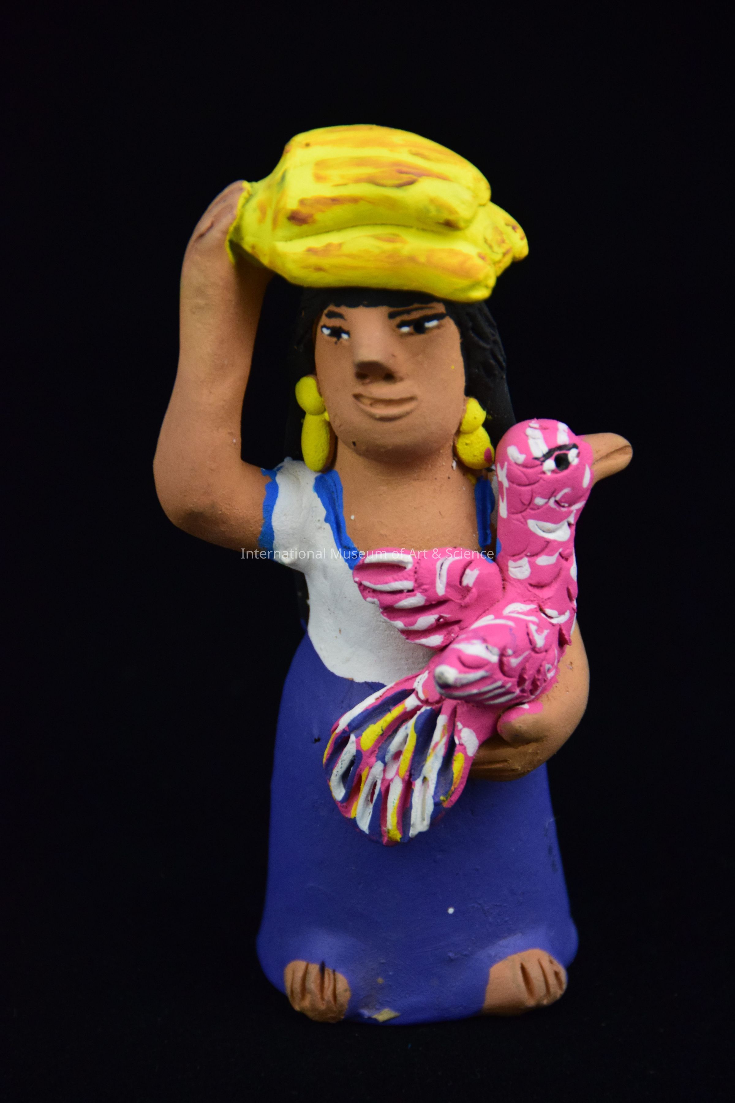 A ceramic figurine of a woman carrying yellow bananas on her head, while holding a pink turkey under her left arm. She is wearing a white blouse and a purple skirt. She is part of a Market Women Scene.