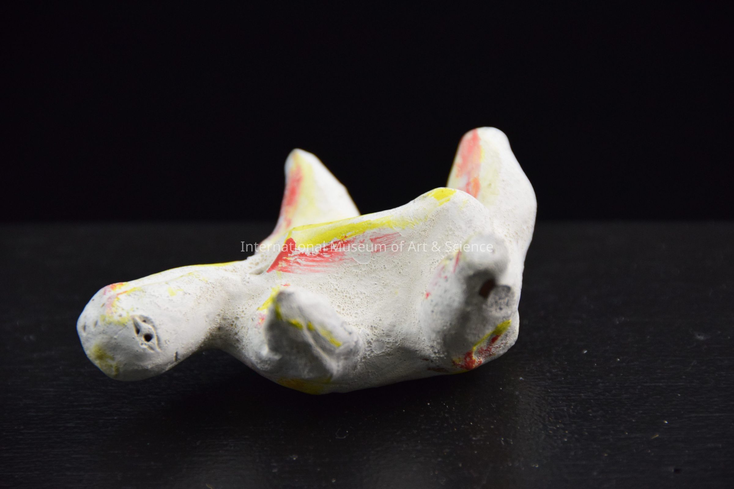A painted bisque clay figurine of an animal. The unidentified animal is painted white with dabs of red and yellow. It has food legs and a head. It is probably representing food. It is part of a 40 piece wedding scene.Dimensions