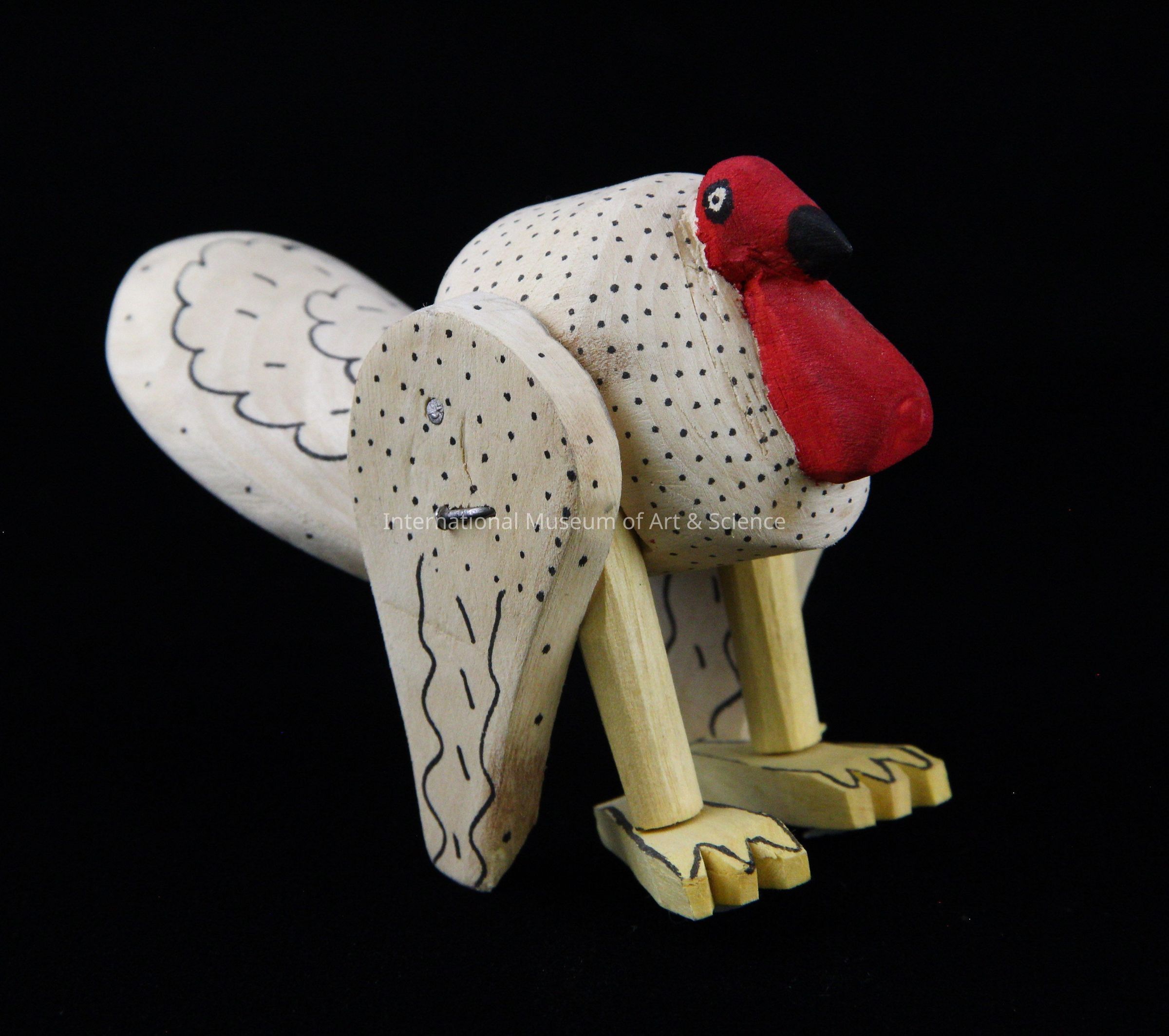 A wood carved figurine of a turkey. Carved of wood with a natural color body. It has a red head and yellow feet. The wings are attached with nails.Dimensions