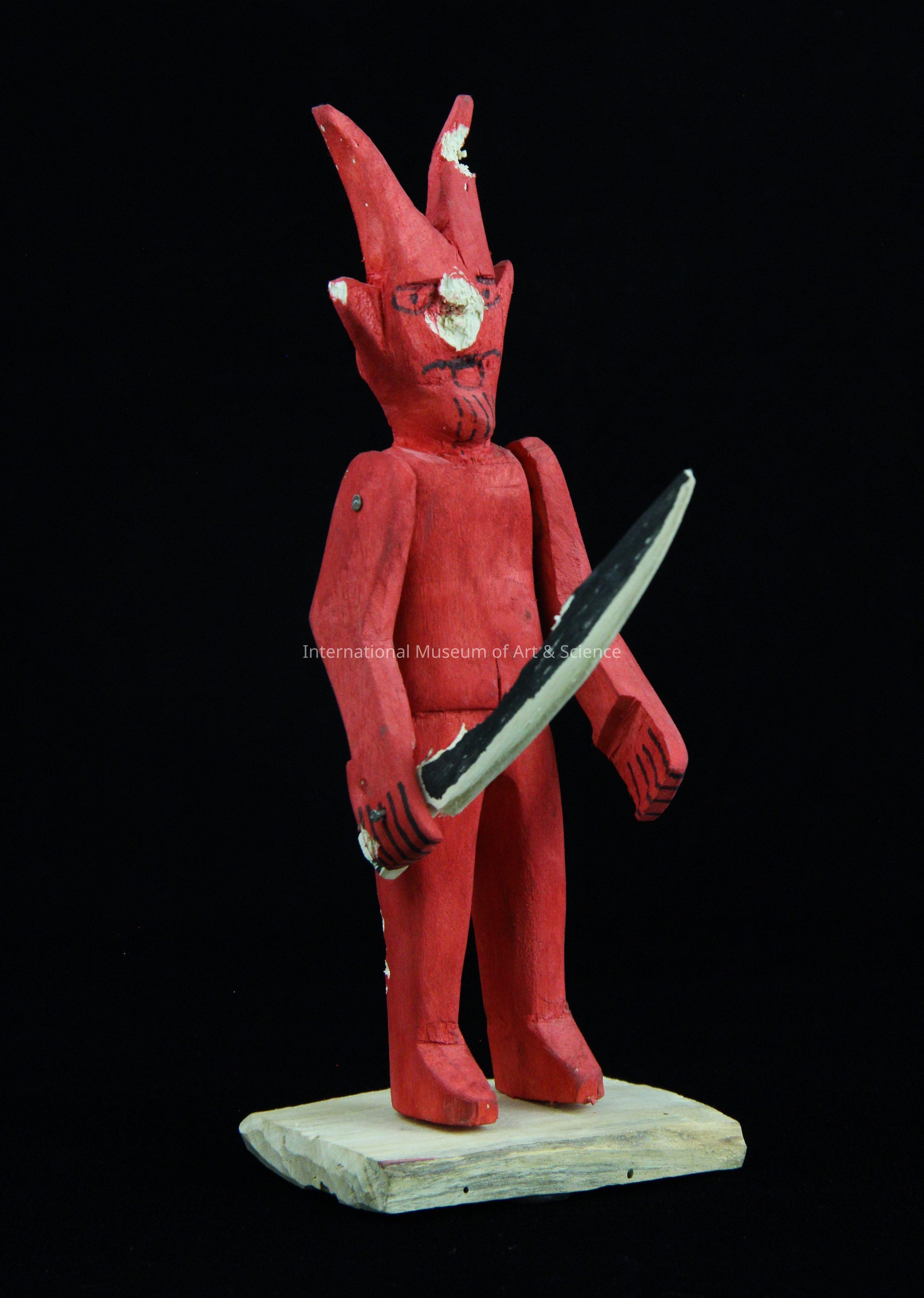 A wood carved figurine of a devil. The figurine is painted red with black details. It is holding a sword and is attached to a wooden base.