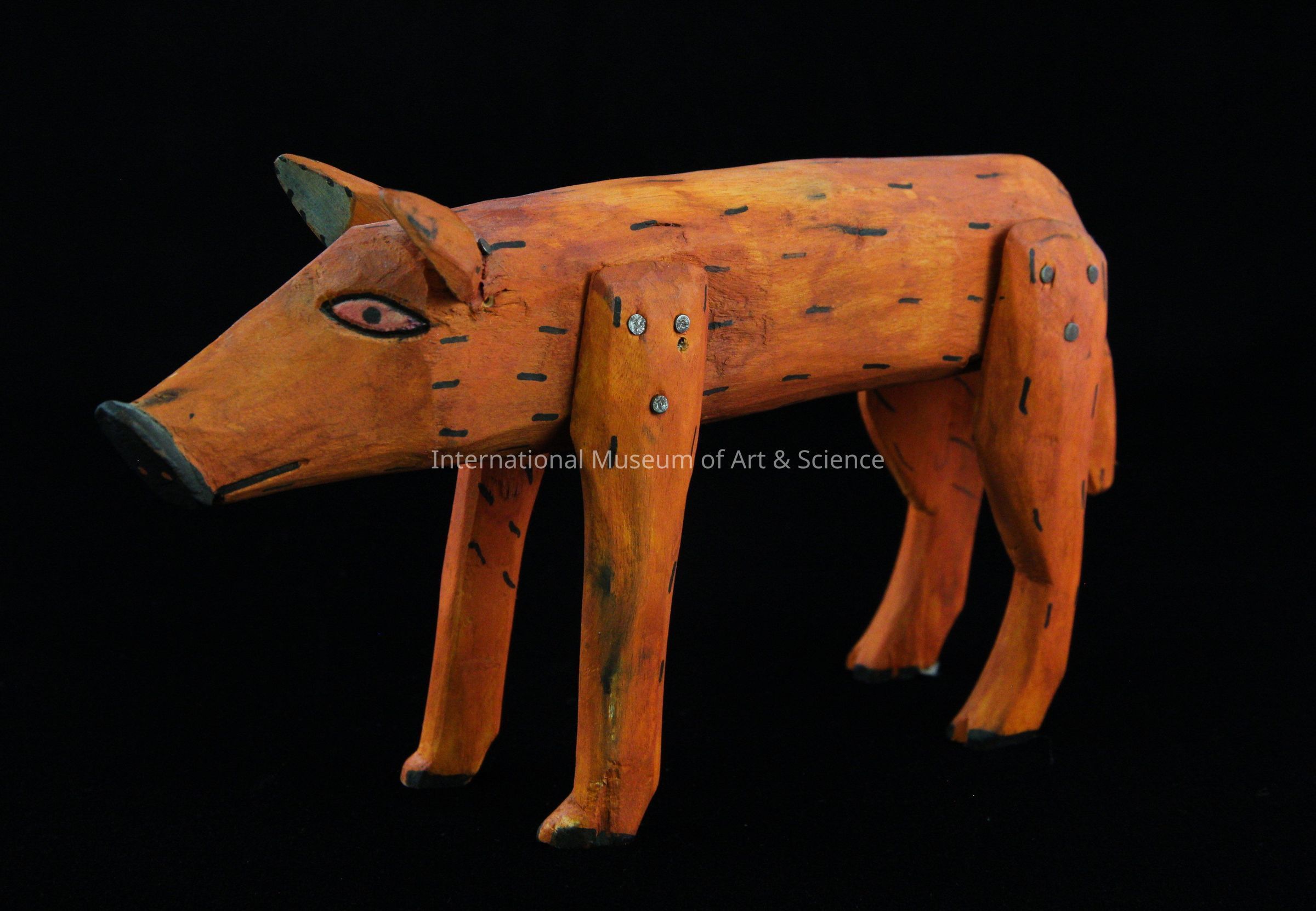 A wooden figurine of a pig. The piece is painted orange with black marls. Its legs and ears are nailed on. It has a black snout and hooves.