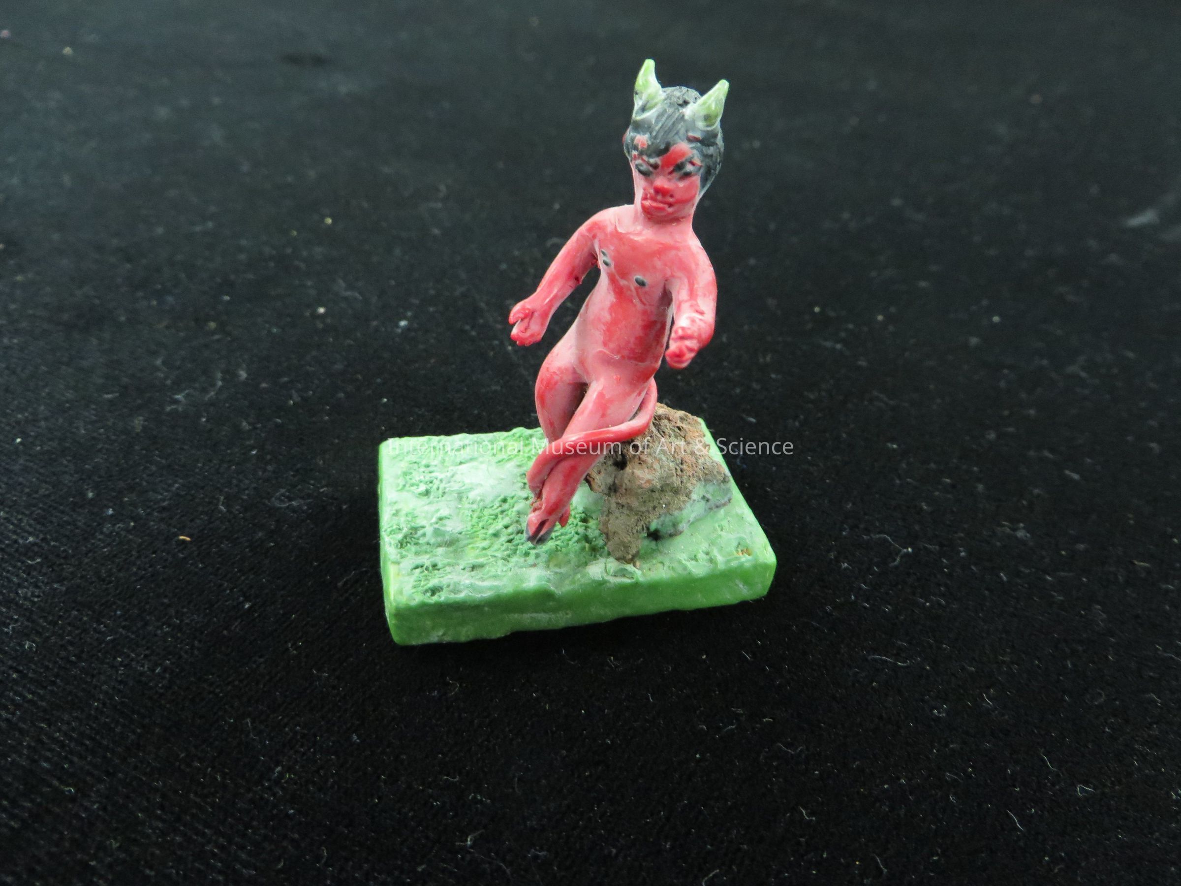 Miniature Devil. Red wax with black horns; seated on rock on square of wood painted green; wood base also coated in wax.Artwork Details