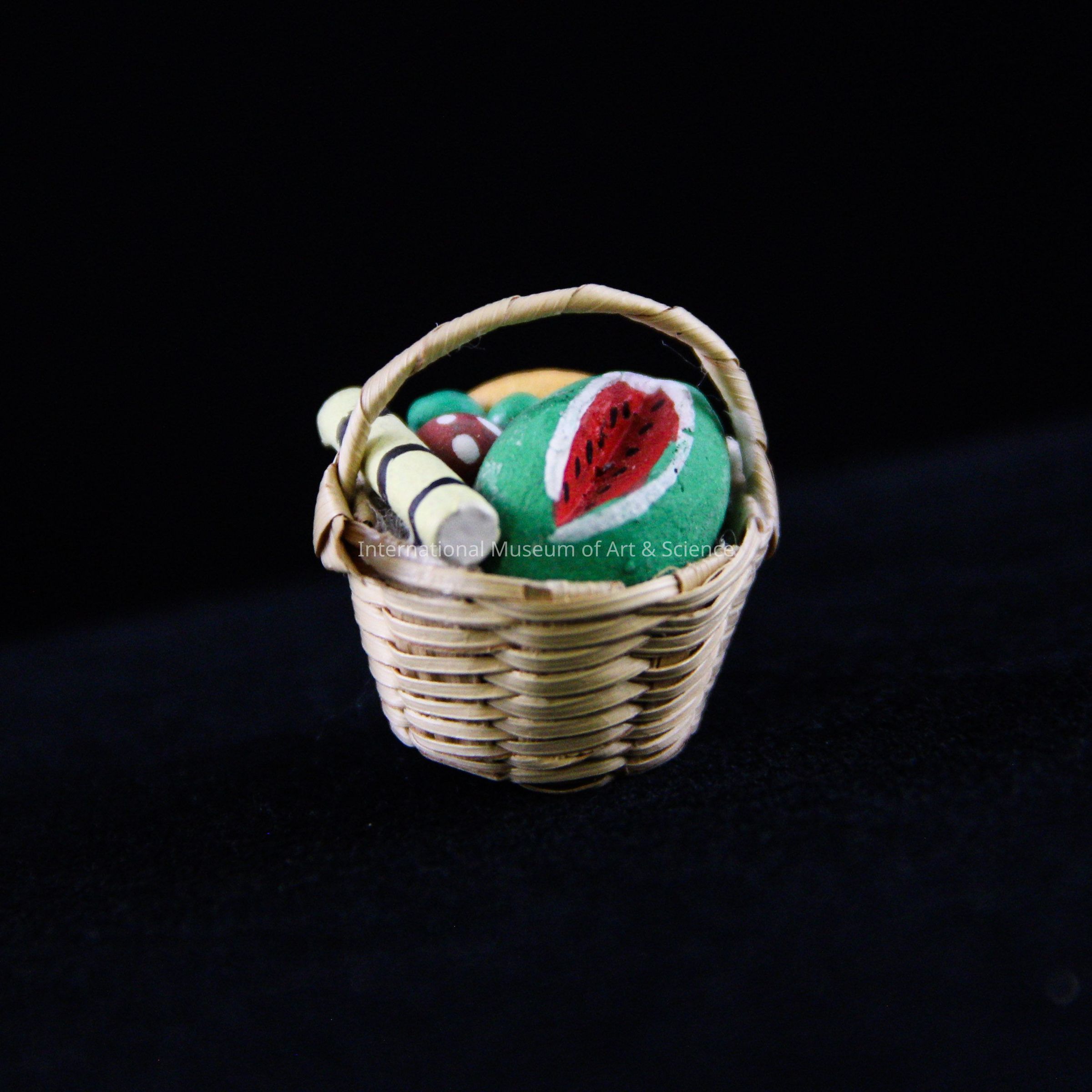 A miniature figurine of a basket with fruit. The basket is made from dried and split palm. Inside of the basket is assorted fruit like watermelon, mango, and limes.Artwork Details
