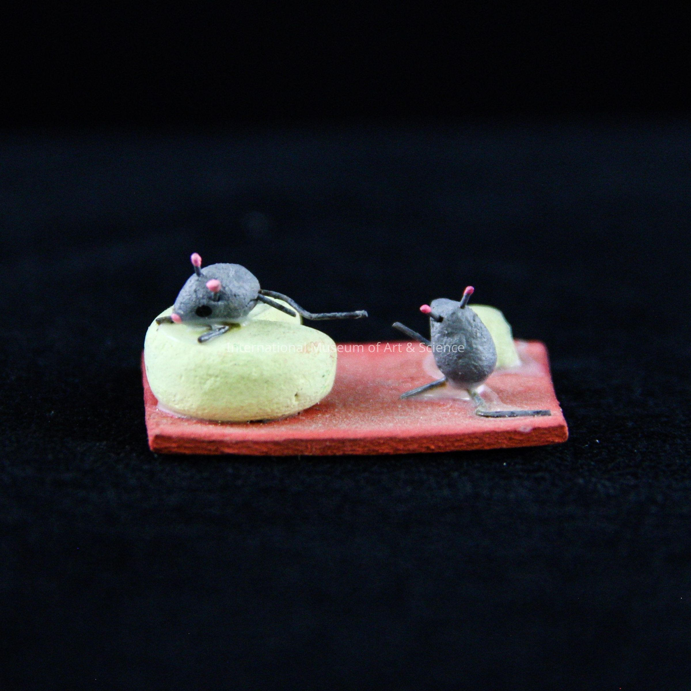 A miniature figurine of mice with cheese. There are two gray mice with yellow cheese made of clay on red cardboard base. Ears, tails, feet are wire.Artwork Details