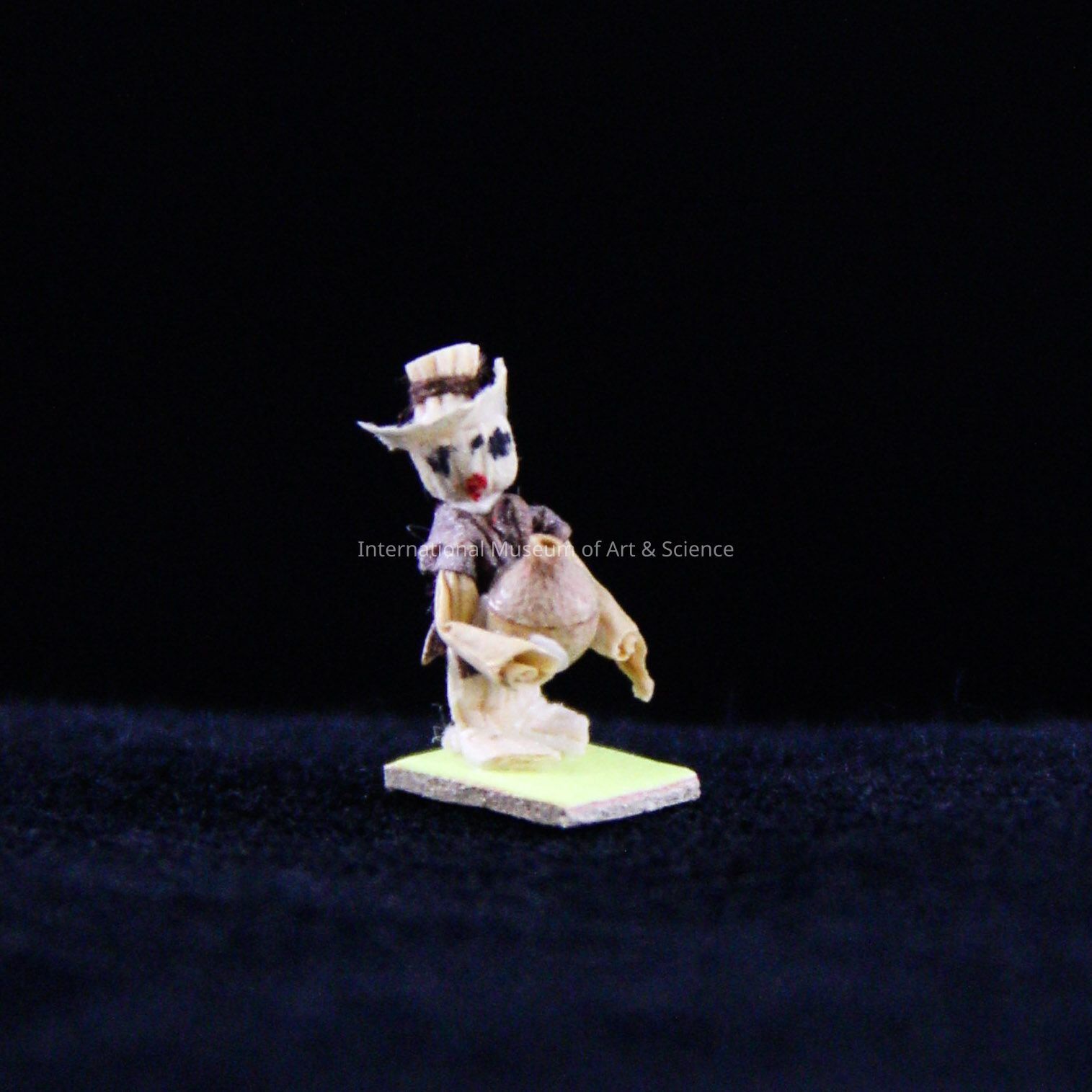 A small figurine made of dried corn husks. The figure is a man holding a jug. He is wearing a hat, and is attached to yellow cardboard base. The jug is a seed.Artwork Details