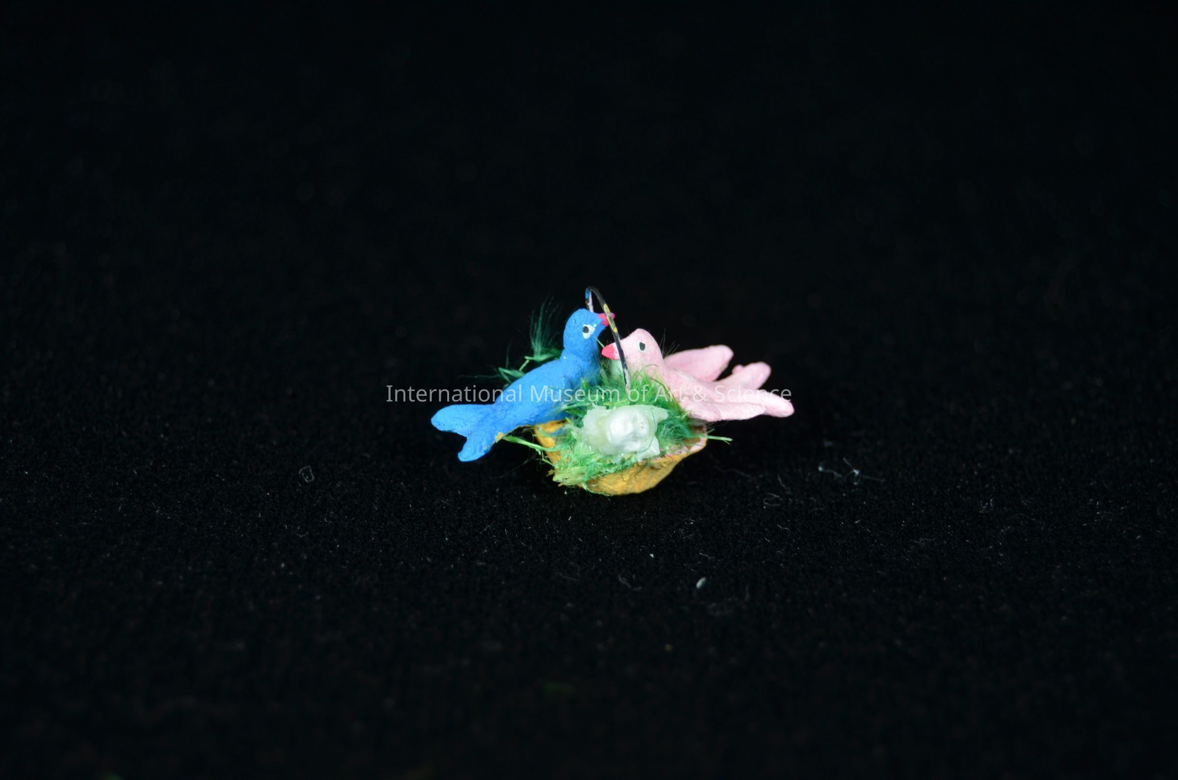 A miniature clay basket with birds. The basket is made of plant fibers painted yellow. there are two clay birds pink and blue in nest. Wire handle inserted. There is a green bed of plant fibers and styrofoam eggs.Artwork Details