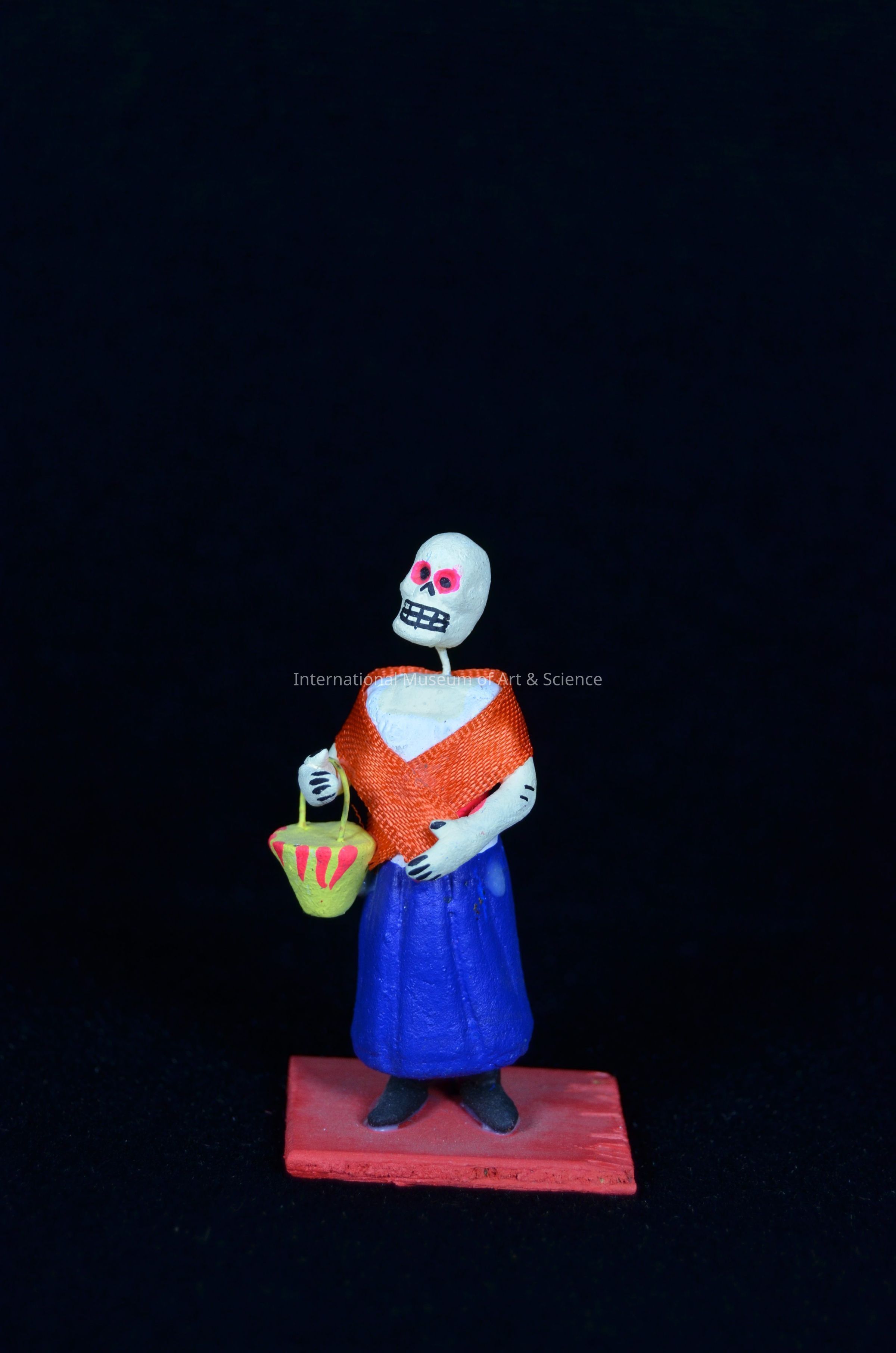 A female skeleton figurine. The figure is wearing a white blouse, a white skirt, with a yellow basket over her arm, a strip of orange ribbon as shawl, and a pink belt. The clay figure is mounted on wooden base painted red. The head is attached to body with wire.Artwork Details
