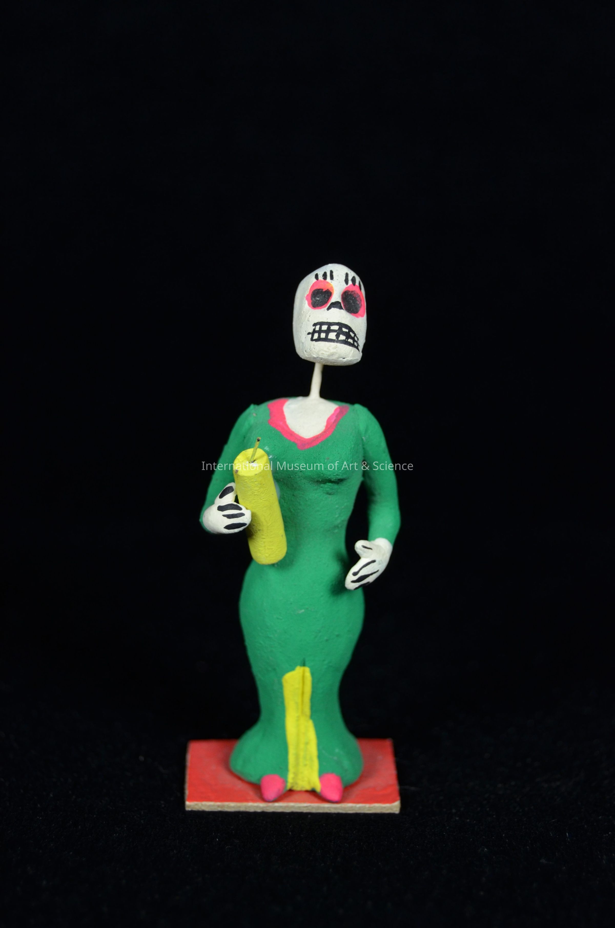 A female skeleton figurine. The figure is wearing a green full length dress, while holding a yellow candle.Artwork Details