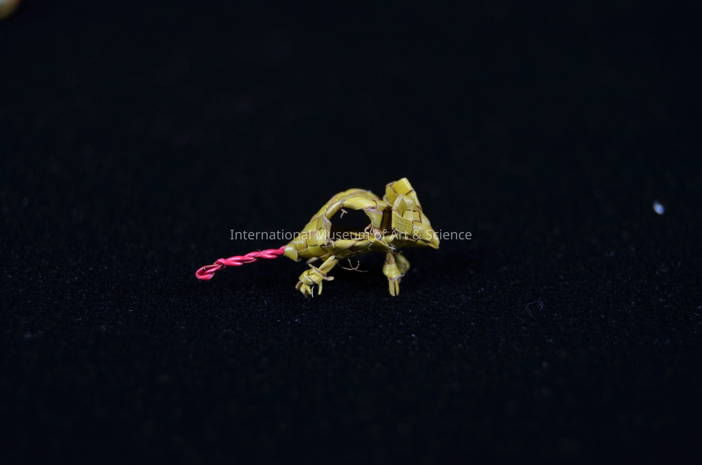A miniature animal figurine. The animal is a small mouse made out of dyed, dried, split palm leaves.