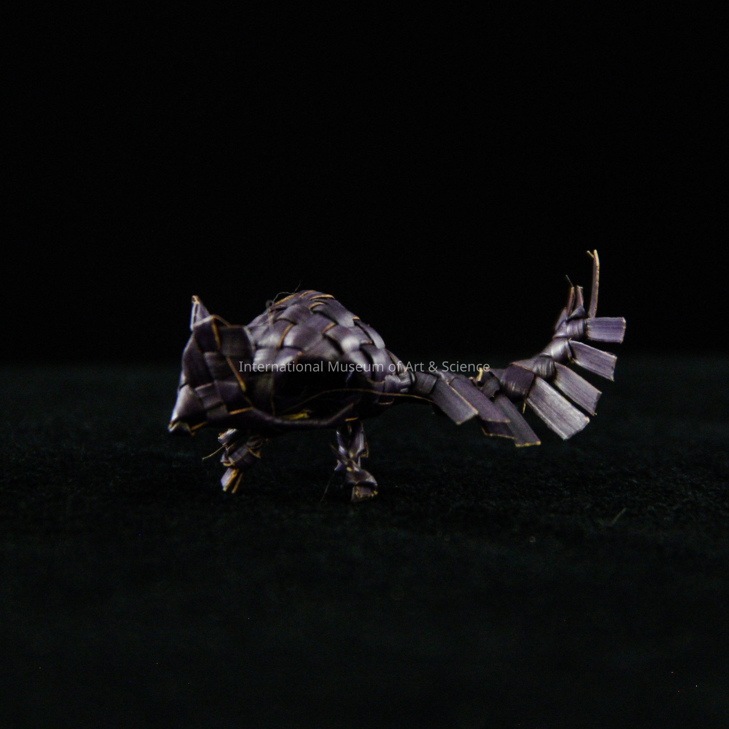 A miniature animal figurine. The animal is a small mouse made out of dyed, dried, split palm leaves.