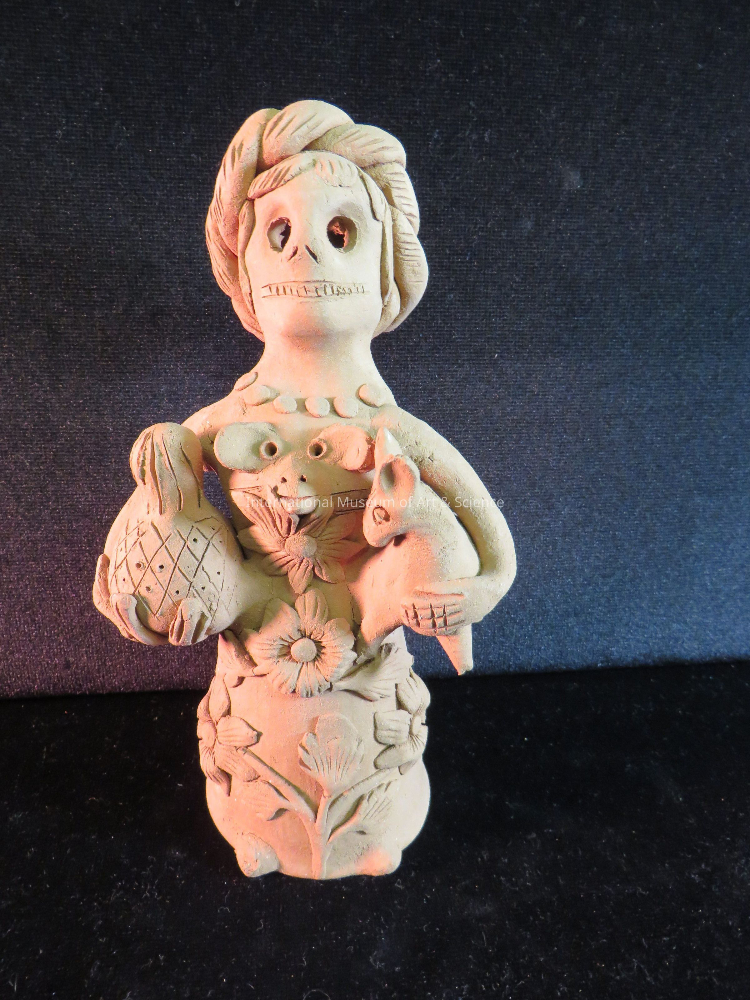 Calavera (female skeleton). Animal head at beast, dress of flowers, right hand holds large pineapple, left hand holds dog, large openings for sightless eyes. Twisted band on head. (Rodete) Unpainted brown clay - flower motifs, hair and rodete applied.Made/Created