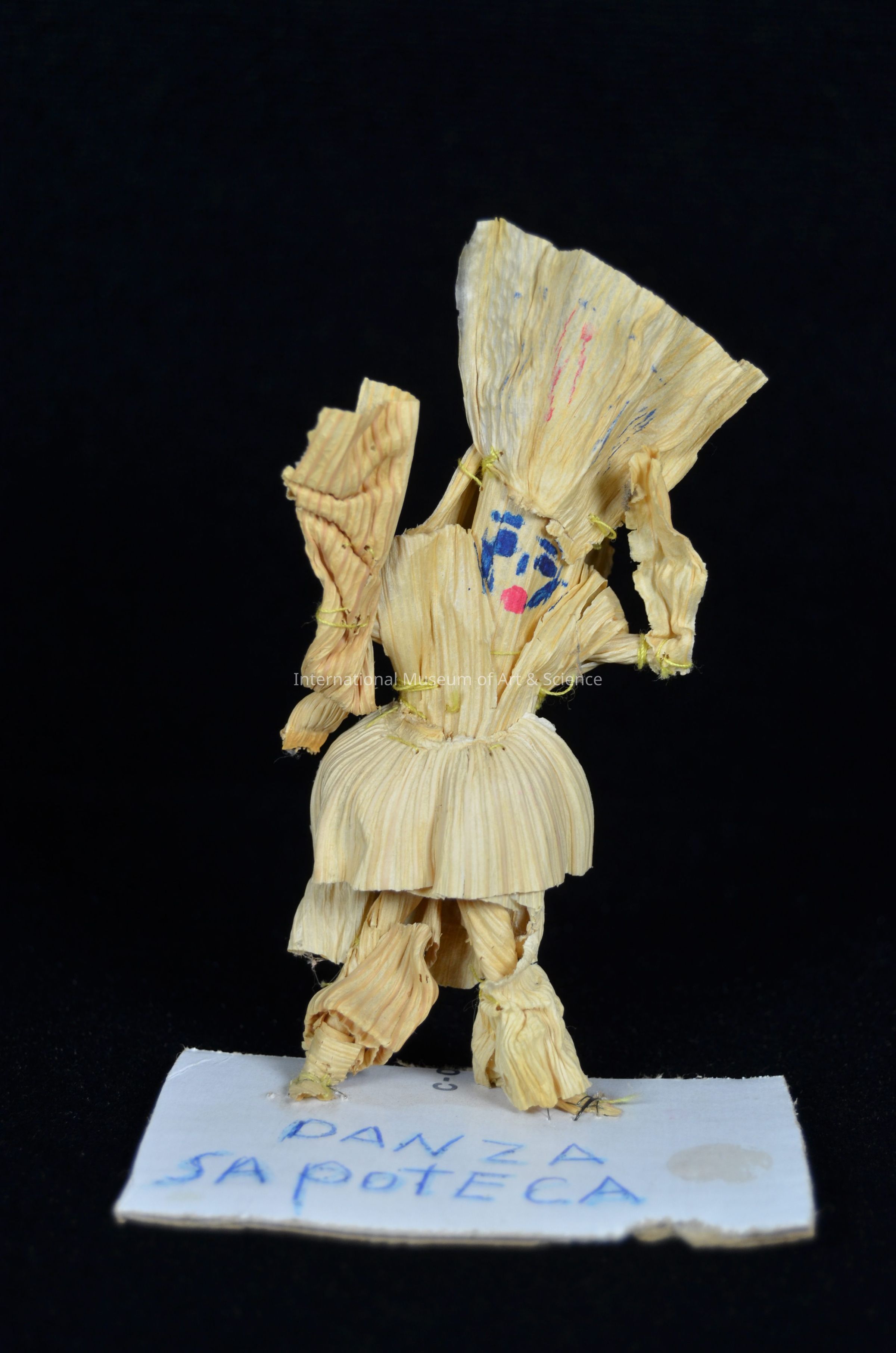 A small corn husk figurine. The figure is a woman wearing a headdress. The facial features are painted on in red and blue. The figure is sewn onto a piece of cardboard. "DANZA SAPOTECA" is written on the base. This figure is part of a set that represents different languages groups from Mexico.Artwork Details