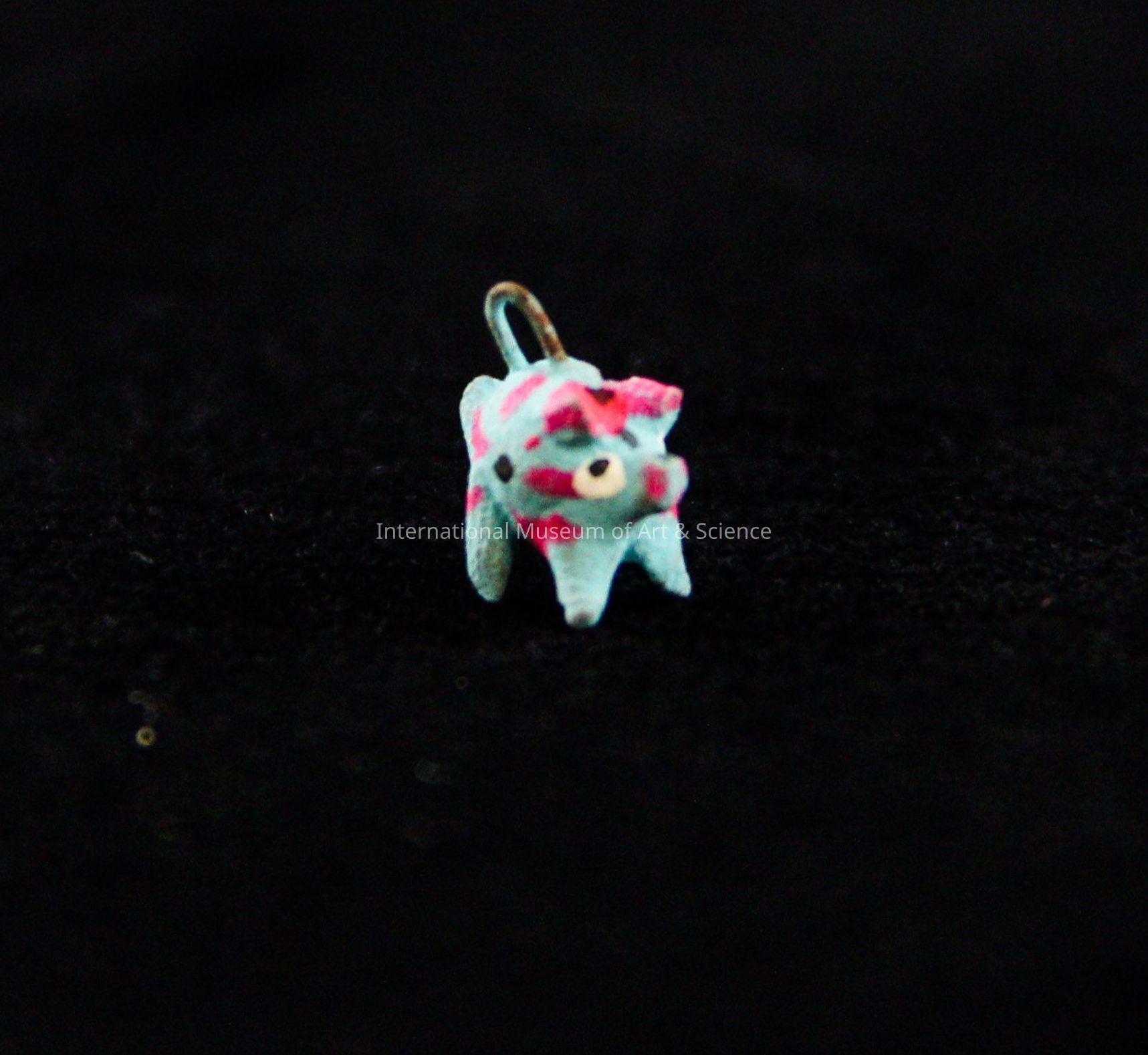 A miniature pig figurine. The pig is made of clay and has been painted blue and pink, with black and whote detailing for the eyes. There is a small wire loop on the pig's back.Dimensions