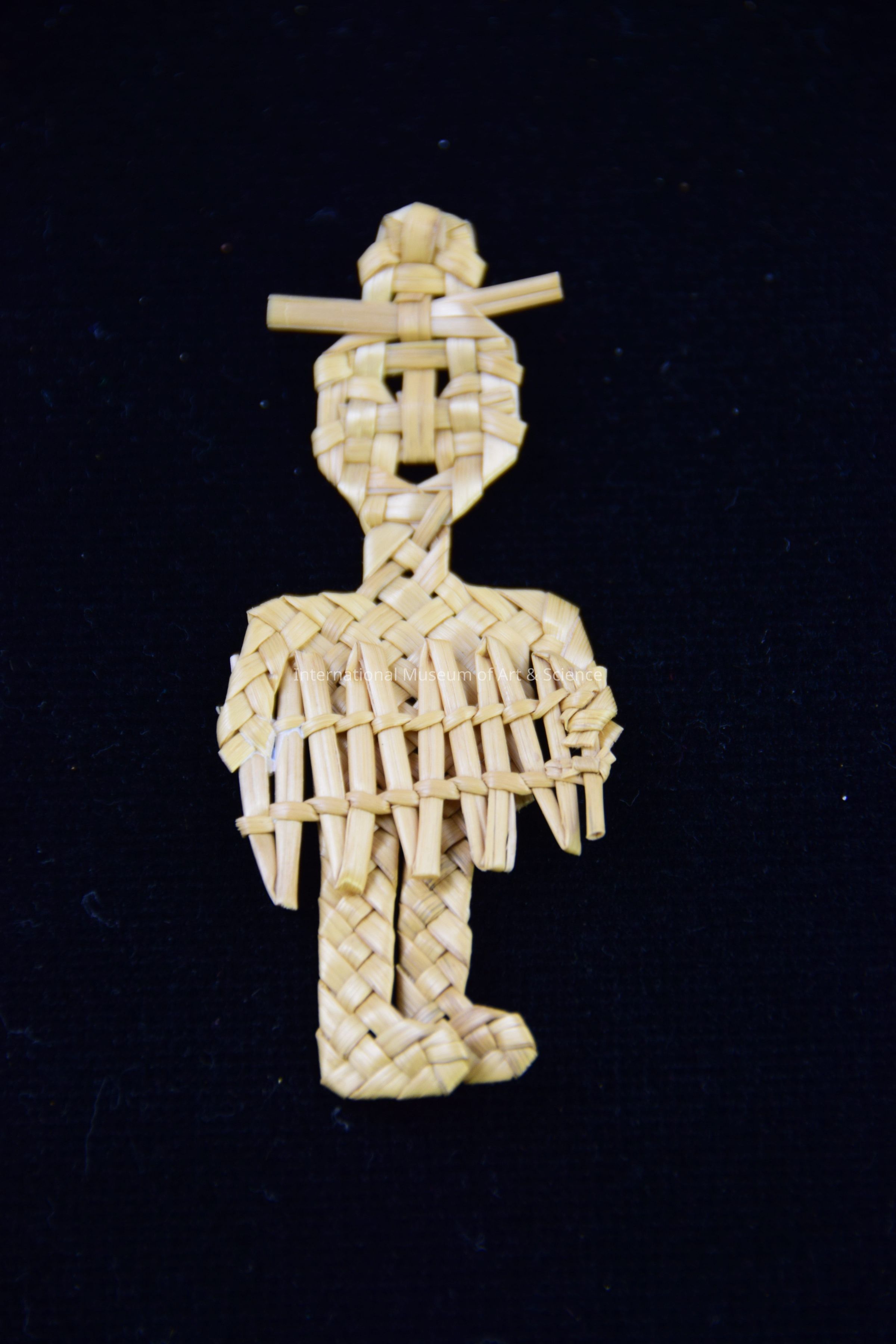 A woven figurine of a musician playing the accordian. The figure is woven from wheat straw.